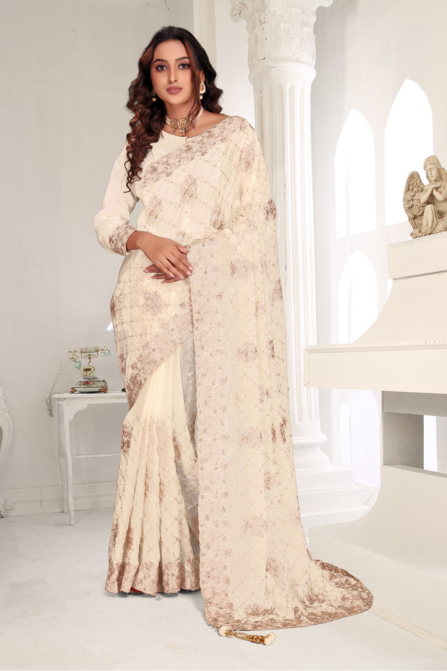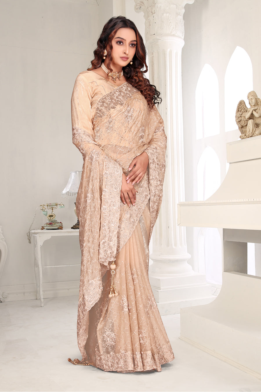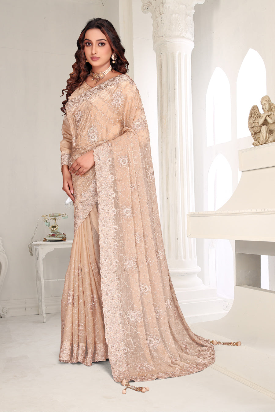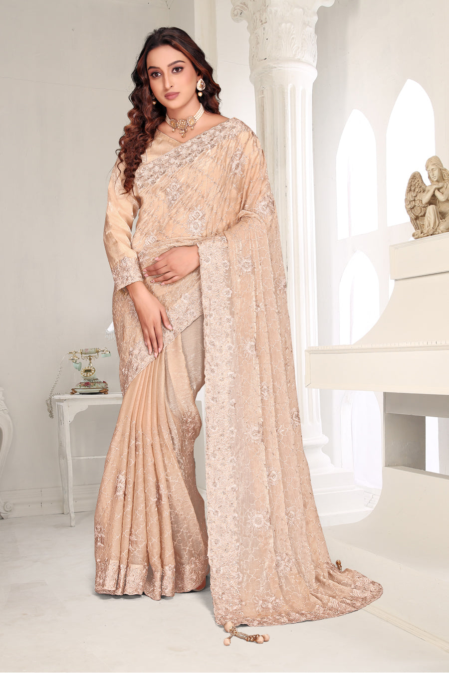 Grace Wrapped in Gold. The Ultimate Festive Statement." Radiate regal elegance with this stunning masterpiece from the Fabeha Prêt Collection. Crafted from high-quality Premium Fandy Chiffon, this saree offers a lightweight yet luxurious drape that flows effortlessly with every step. The fabric is transformed into a work of art with heavy Golden Zari work and intricate floral embroidery, creating a majestic glow perfect for weddings and celebrations. We’ve finished the look with an exquisite embroidered border and delicate, stylish tassels that add a refined, elegant sway to the pallu. This is affordable luxury defined—giving you the grand "Royal Wedding" look on a comfortable, wearable fabric. The Perfect Fit: Couture-Style Adjustable BlouseExperience the confidence of a custom fit with our ready-to-wear Princess Cut blouse. Engineered to hug your curves with a convenient front opening, it marries comfort with absolute glamour.