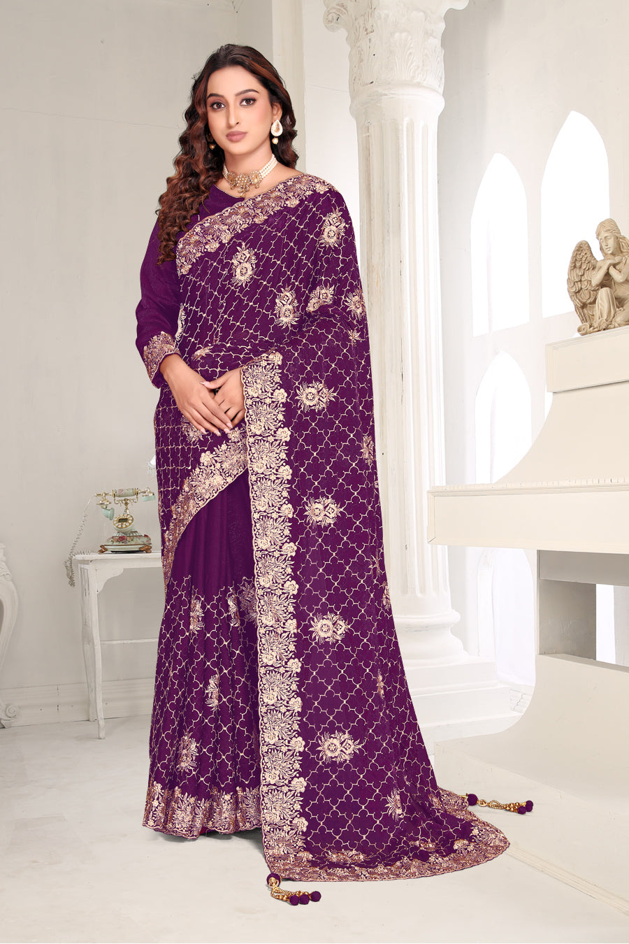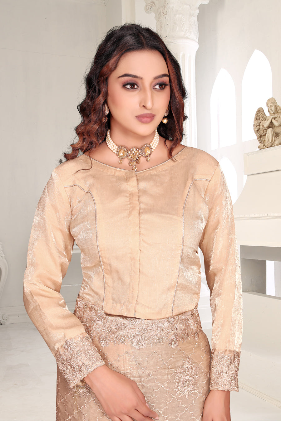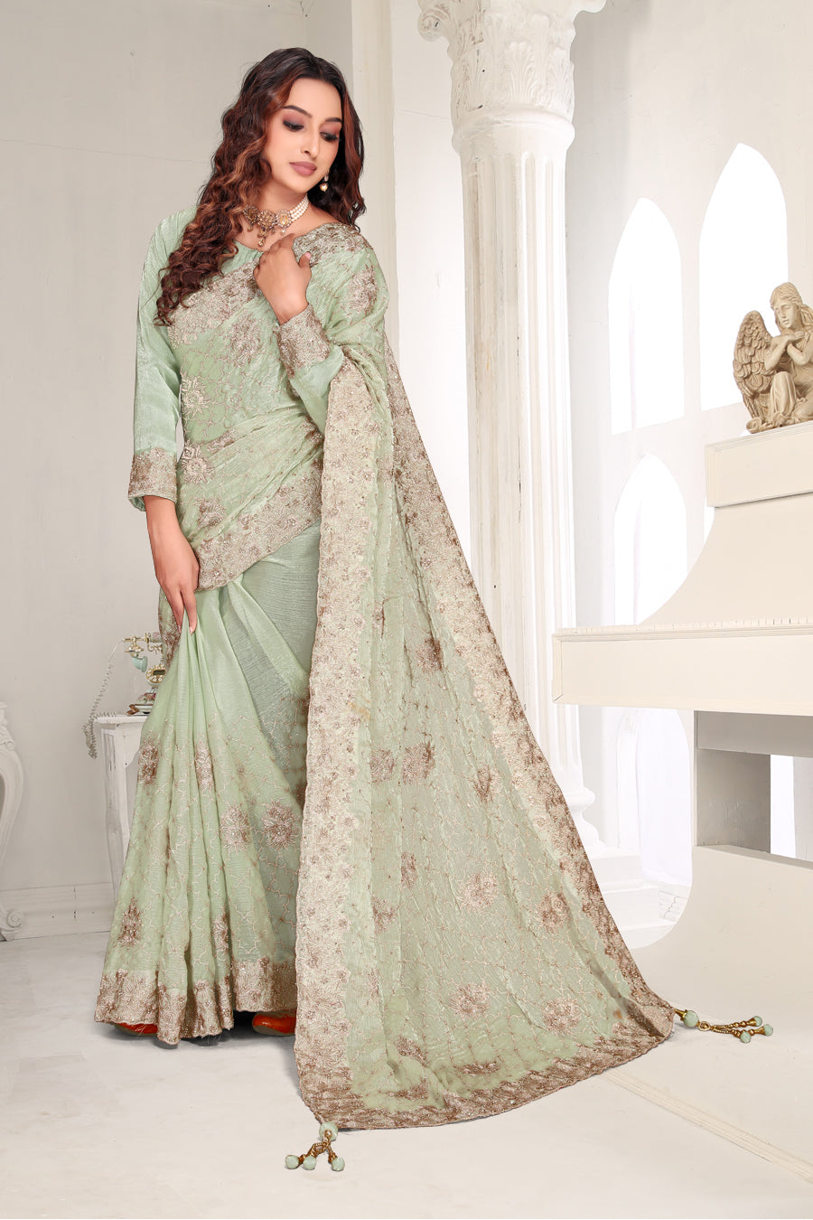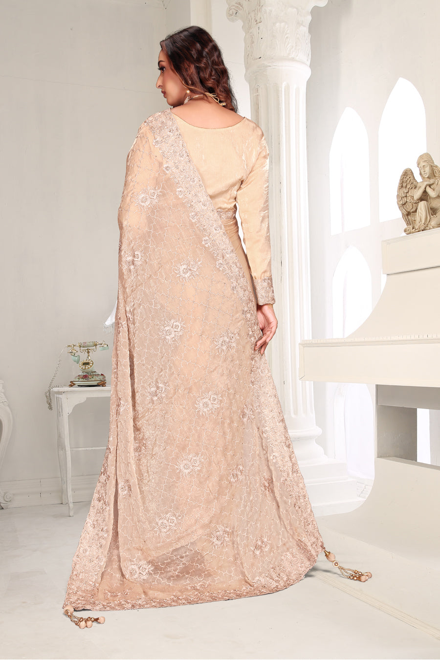 Grace Wrapped in Gold. The Ultimate Festive Statement." Radiate regal elegance with this stunning masterpiece from the Fabeha Prêt Collection. Crafted from high-quality Premium Fandy Chiffon, this saree offers a lightweight yet luxurious drape that flows effortlessly with every step. The fabric is transformed into a work of art with heavy Golden Zari work and intricate floral embroidery, creating a majestic glow perfect for weddings and celebrations. We’ve finished the look with an exquisite embroidered border and delicate, stylish tassels that add a refined, elegant sway to the pallu. This is affordable luxury defined—giving you the grand "Royal Wedding" look on a comfortable, wearable fabric. The Perfect Fit: Couture-Style Adjustable BlouseExperience the confidence of a custom fit with our ready-to-wear Princess Cut blouse. Engineered to hug your curves with a convenient front opening, it marries comfort with absolute glamour.