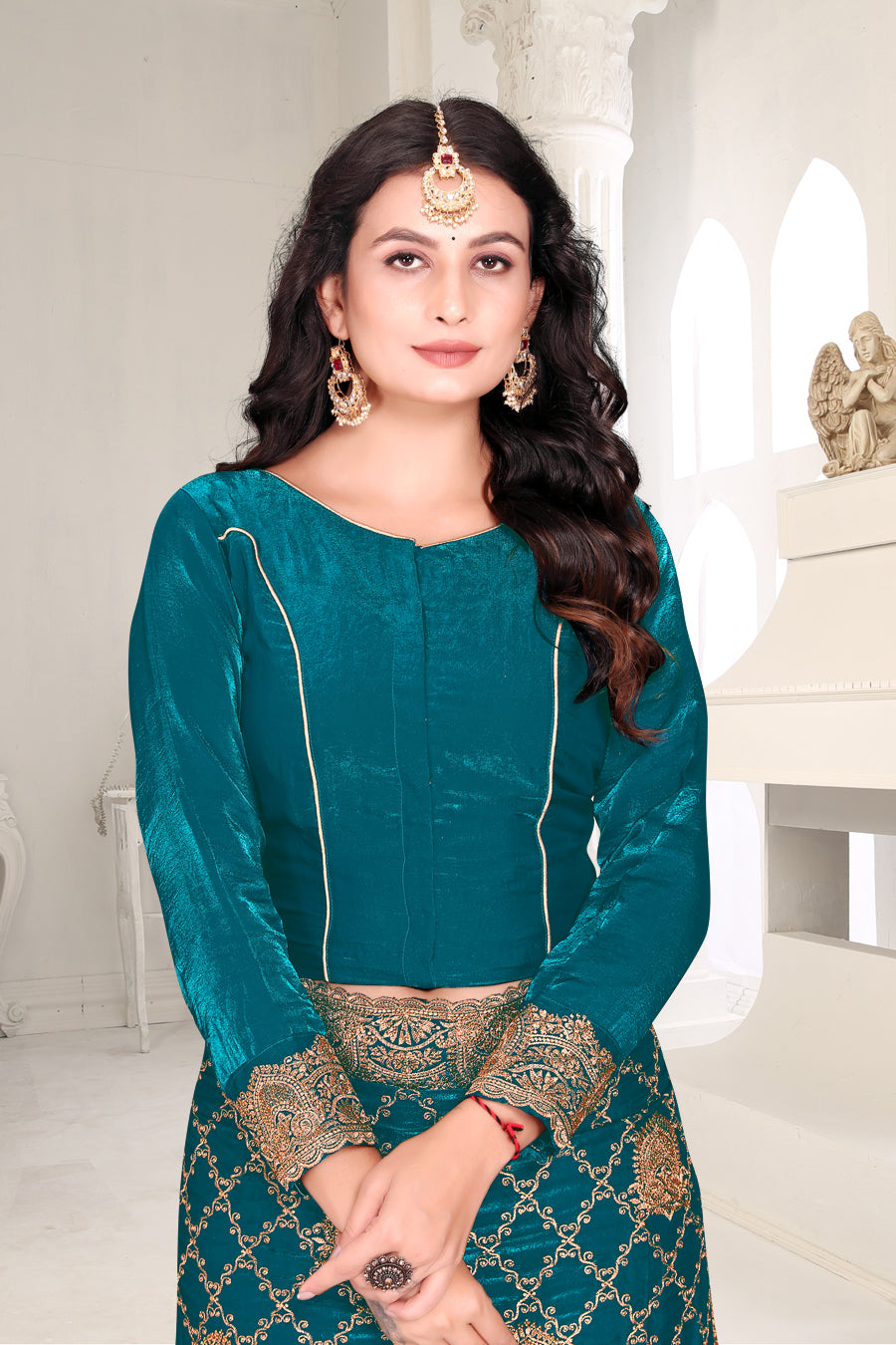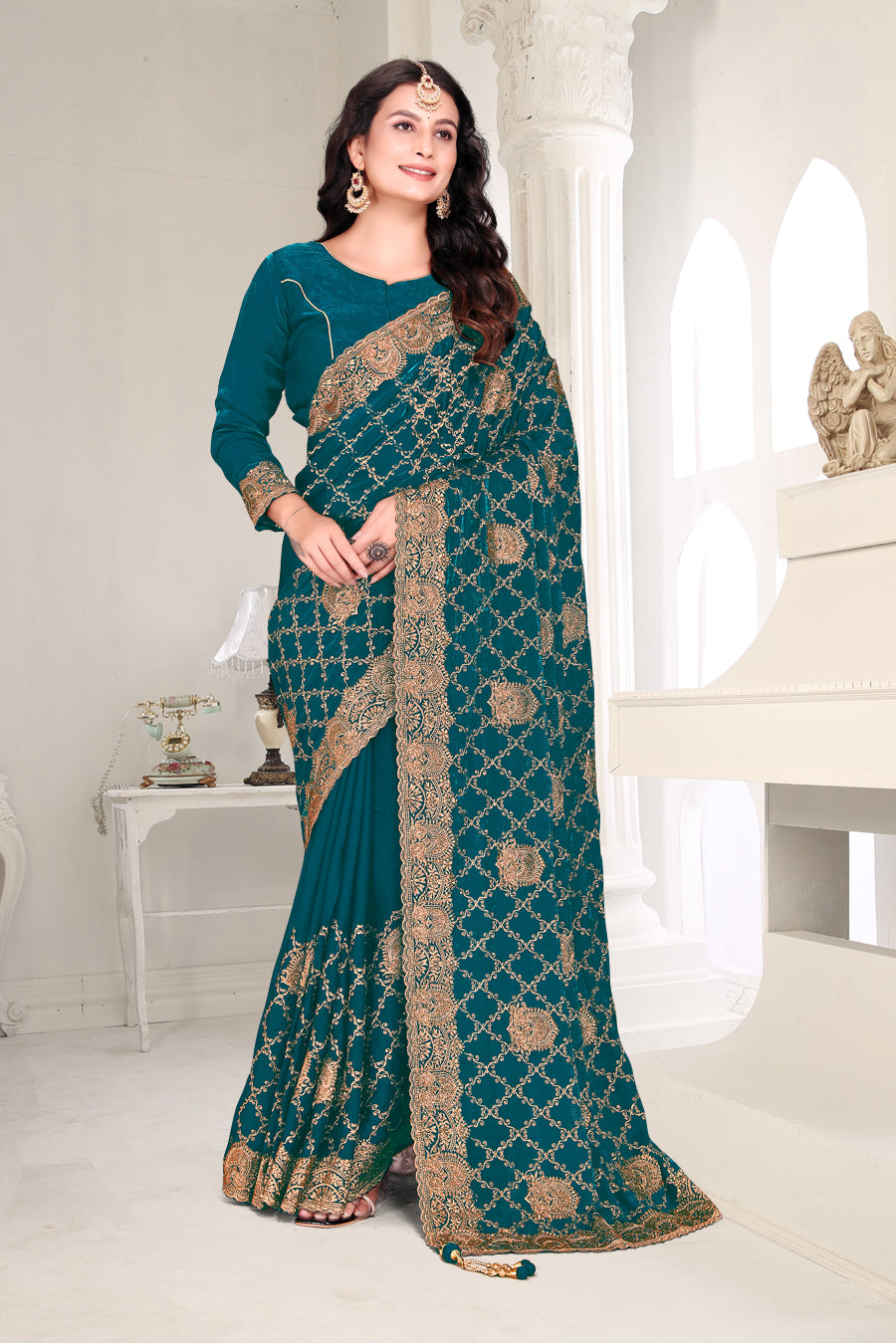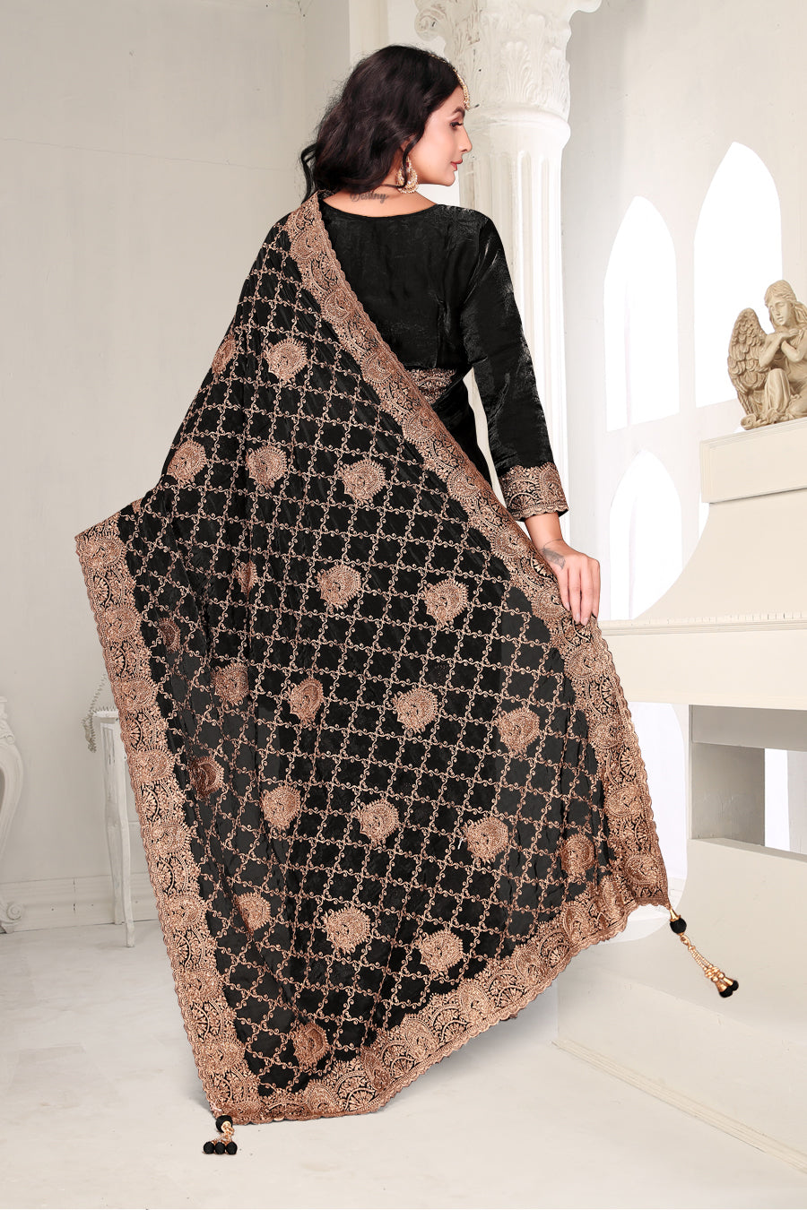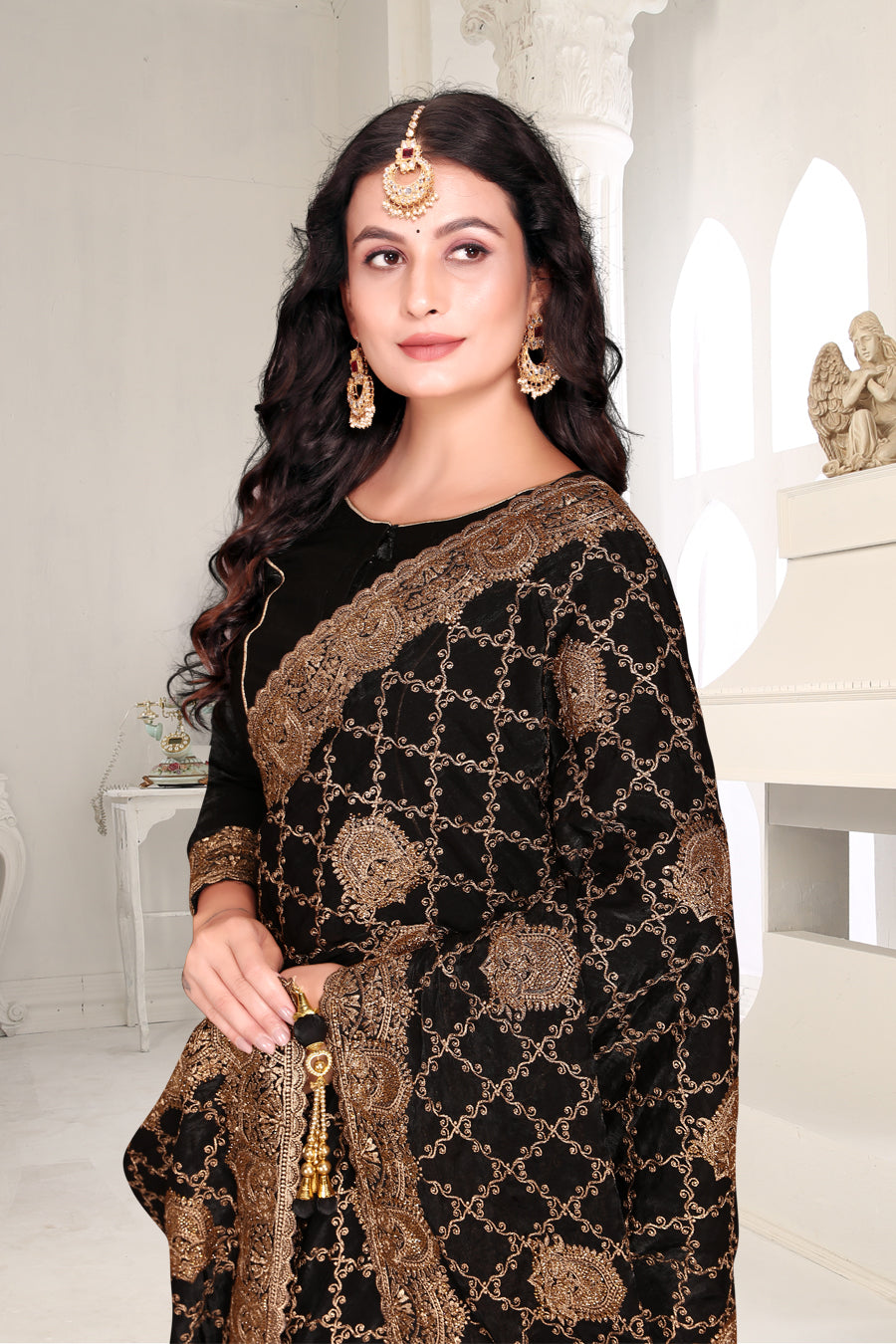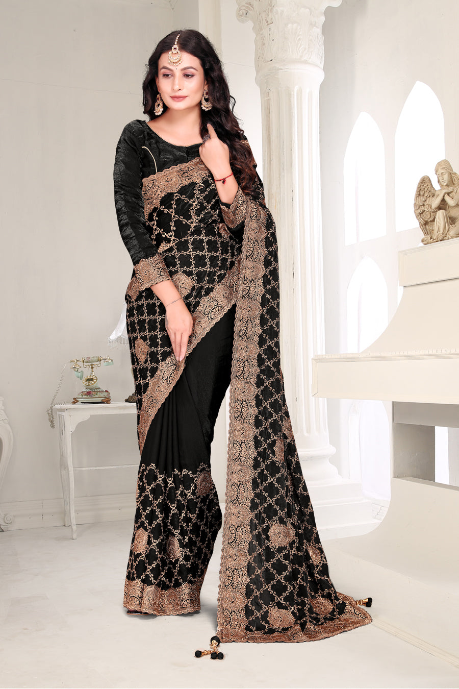 "Drape Yourself in Vintage Royalty. A Masterpiece of Satin & Sparkle." Embrace the grandeur of a bygone era with this luxurious statement piece from the Fabeha Prêt Collection. Designed to make you feel regal, this saree is crafted from Lux Fandy Satin, a premium fabric known for its rich, glossy sheen and effortless drape. The fabric is lavishly adorned with all-over floral and geometric threadwork, interlaced with golden Zari and shimmering sequins that catch the light from every angle. The defining feature of this ensemble is the intricate scalloped border (cutwork), which adds a high-end, contemporary finish to the traditional heavy embroidery. Whether it’s a wedding reception or a festive soirée, this saree promises a look of absolute majesty and sophisticated glamour. The Perfect Fit: Couture-Style Adjustable BlouseExperience the confidence of a custom fit with our ready-to-wear Princess Cut blouse. Engineered to hug your curves with a convenient front opening, it marries comfort with absolute glamour.