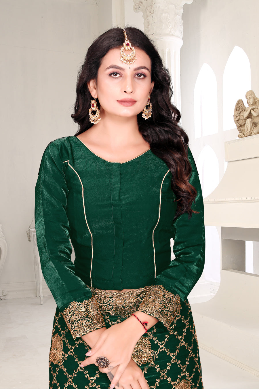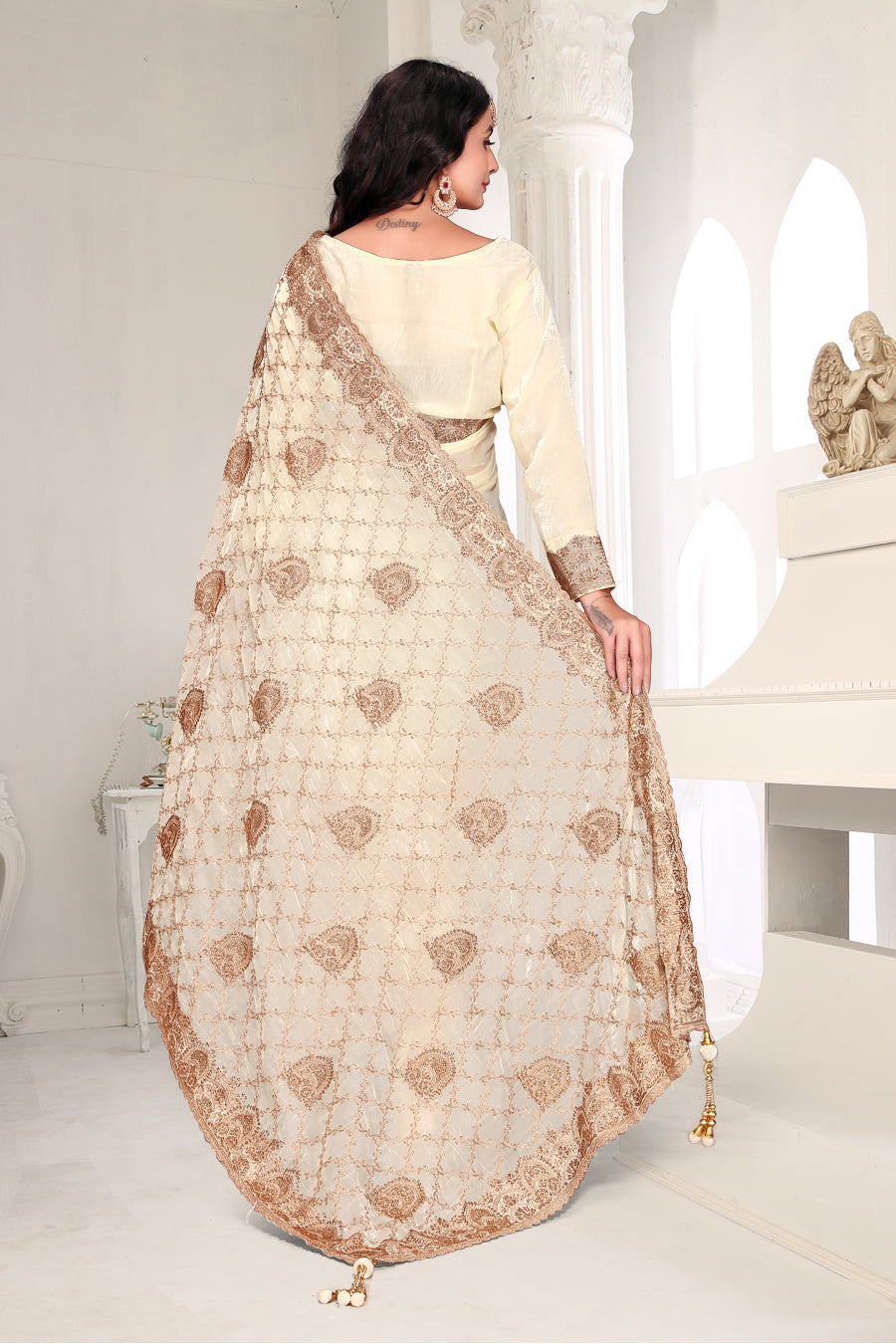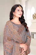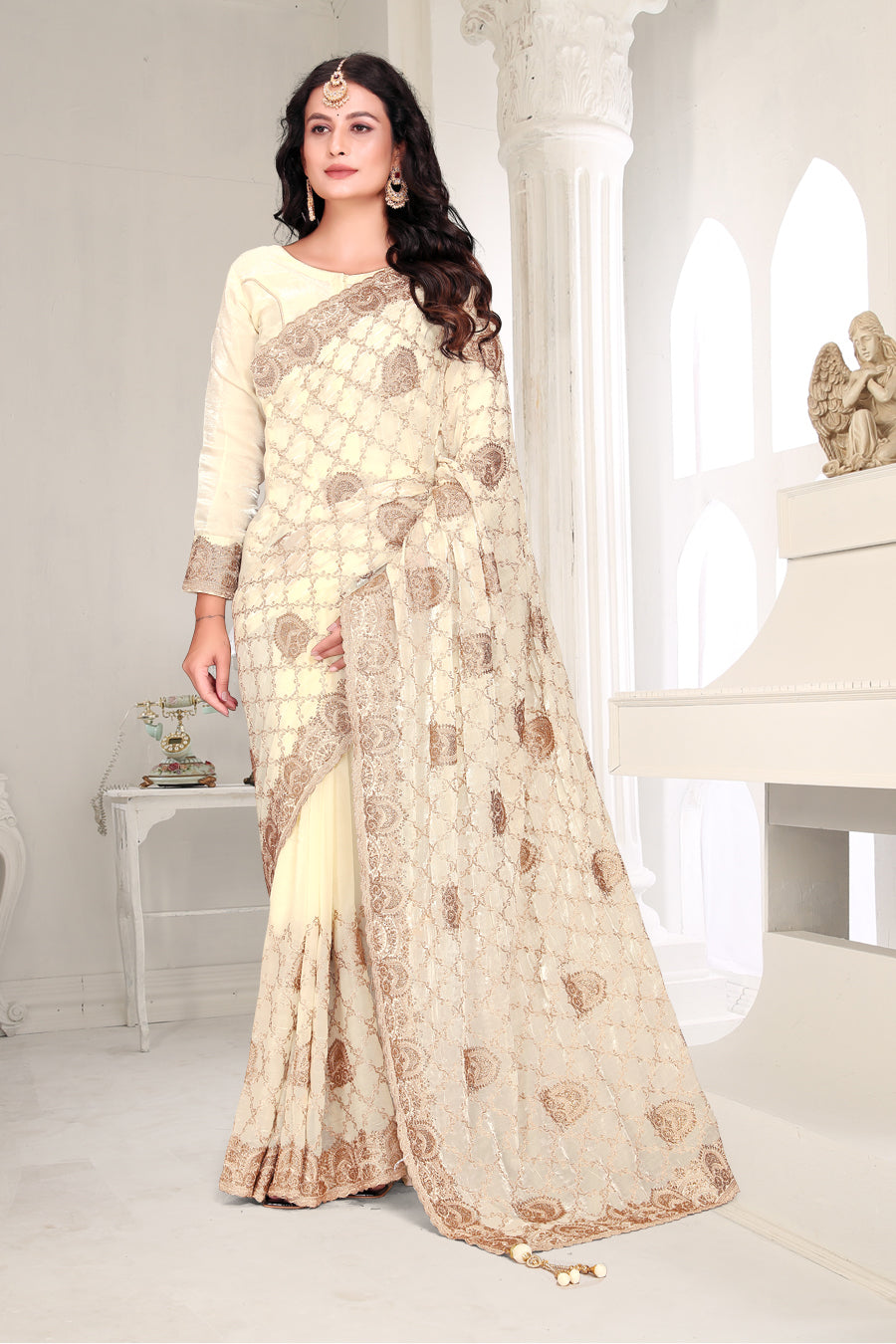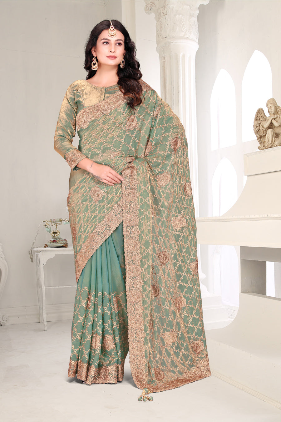 "Drape Yourself in Vintage Royalty. A Masterpiece of Satin & Sparkle." Embrace the grandeur of a bygone era with this luxurious statement piece from the Fabeha Prêt Collection. Designed to make you feel regal, this saree is crafted from Lux Fandy Satin, a premium fabric known for its rich, glossy sheen and effortless drape. The fabric is lavishly adorned with all-over floral and geometric threadwork, interlaced with golden Zari and shimmering sequins that catch the light from every angle. The defining feature of this ensemble is the intricate scalloped border (cutwork), which adds a high-end, contemporary finish to the traditional heavy embroidery. Whether it’s a wedding reception or a festive soirée, this saree promises a look of absolute majesty and sophisticated glamour. The Perfect Fit: Couture-Style Adjustable BlouseExperience the confidence of a custom fit with our ready-to-wear Princess Cut blouse. Engineered to hug your curves with a convenient front opening, it marries comfort with absolute glamour.