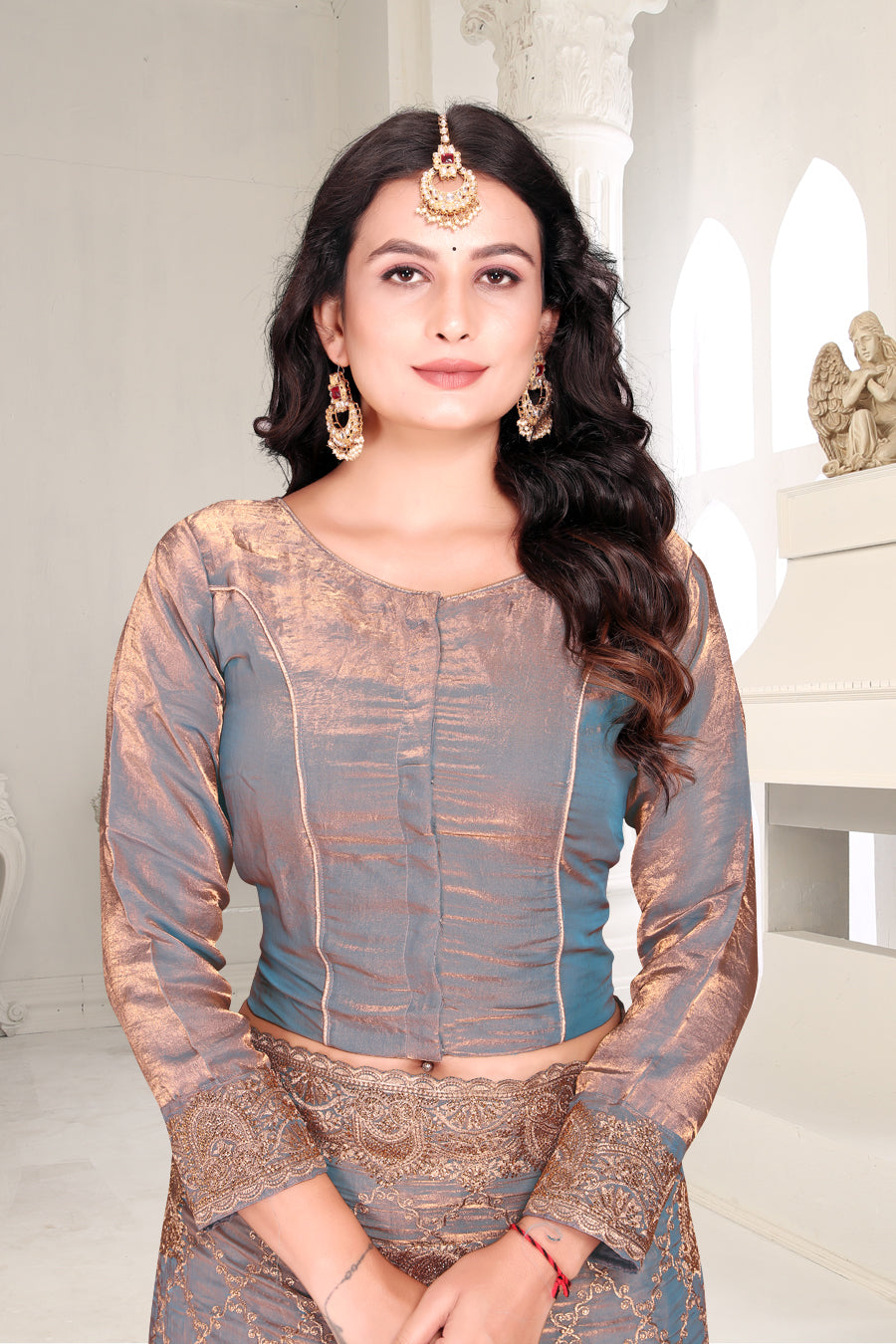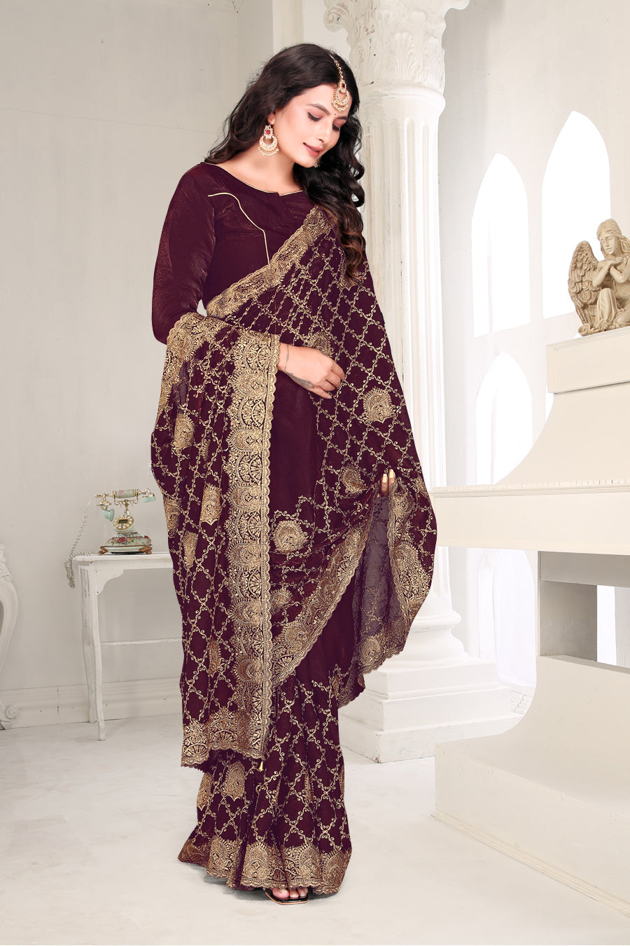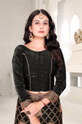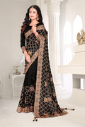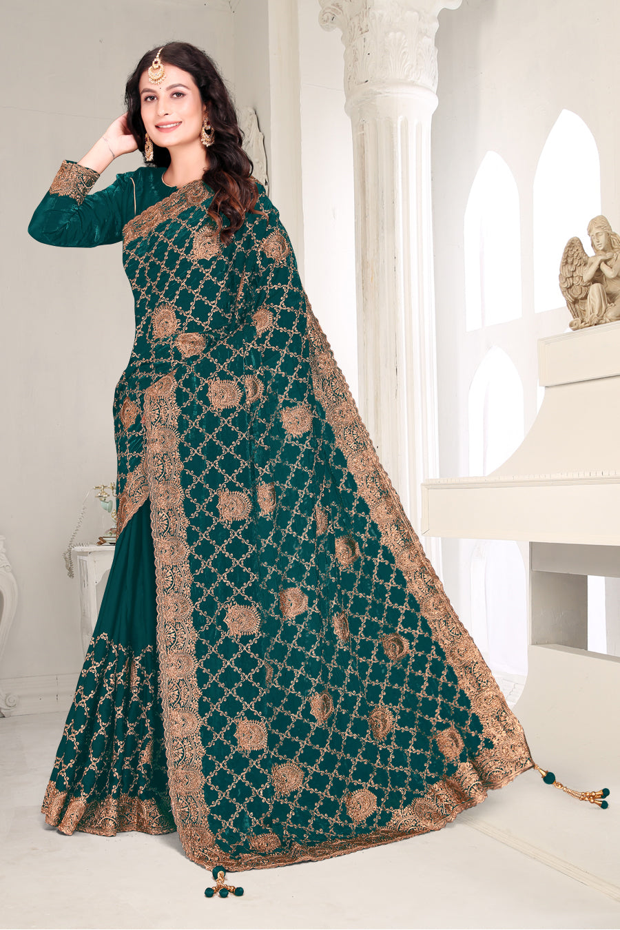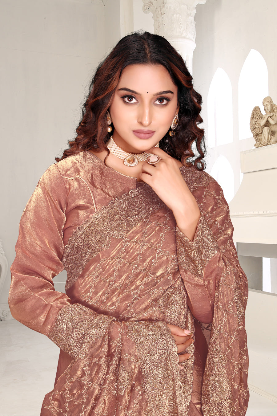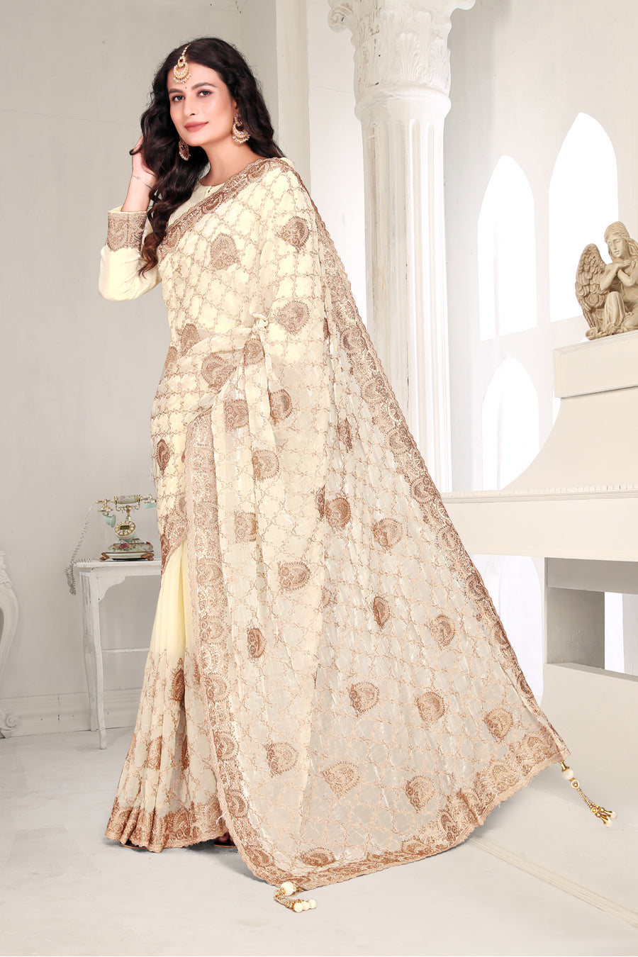 "Drape Yourself in Vintage Royalty. A Masterpiece of Satin & Sparkle." Embrace the grandeur of a bygone era with this luxurious statement piece from the Fabeha Prêt Collection. Designed to make you feel regal, this saree is crafted from Lux Fandy Satin, a premium fabric known for its rich, glossy sheen and effortless drape. The fabric is lavishly adorned with all-over floral and geometric threadwork, interlaced with golden Zari and shimmering sequins that catch the light from every angle. The defining feature of this ensemble is the intricate scalloped border (cutwork), which adds a high-end, contemporary finish to the traditional heavy embroidery. Whether it’s a wedding reception or a festive soirée, this saree promises a look of absolute majesty and sophisticated glamour. The Perfect Fit: Couture-Style Adjustable BlouseExperience the confidence of a custom fit with our ready-to-wear Princess Cut blouse. Engineered to hug your curves with a convenient front opening, it marries comfort with absolute glamour.