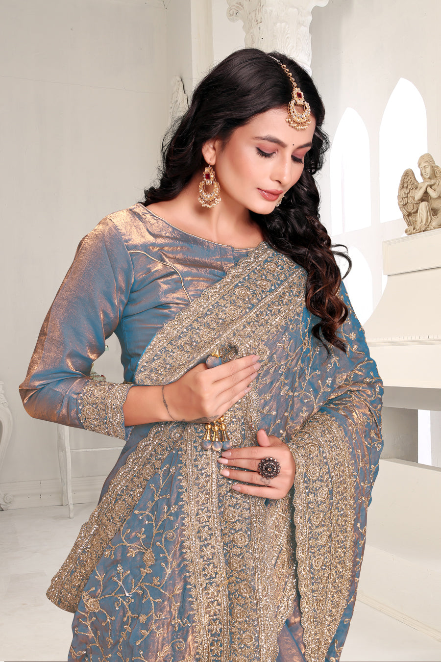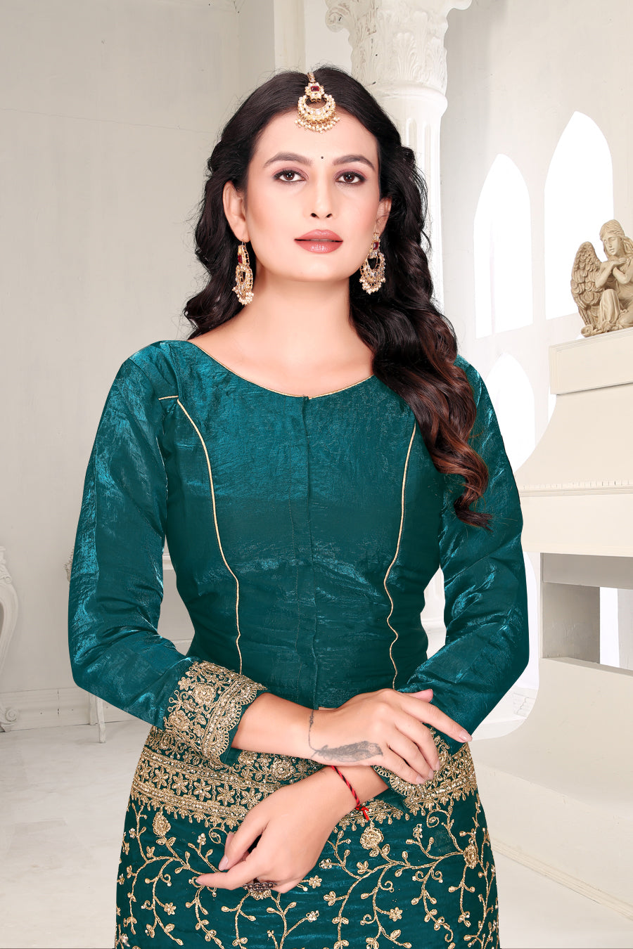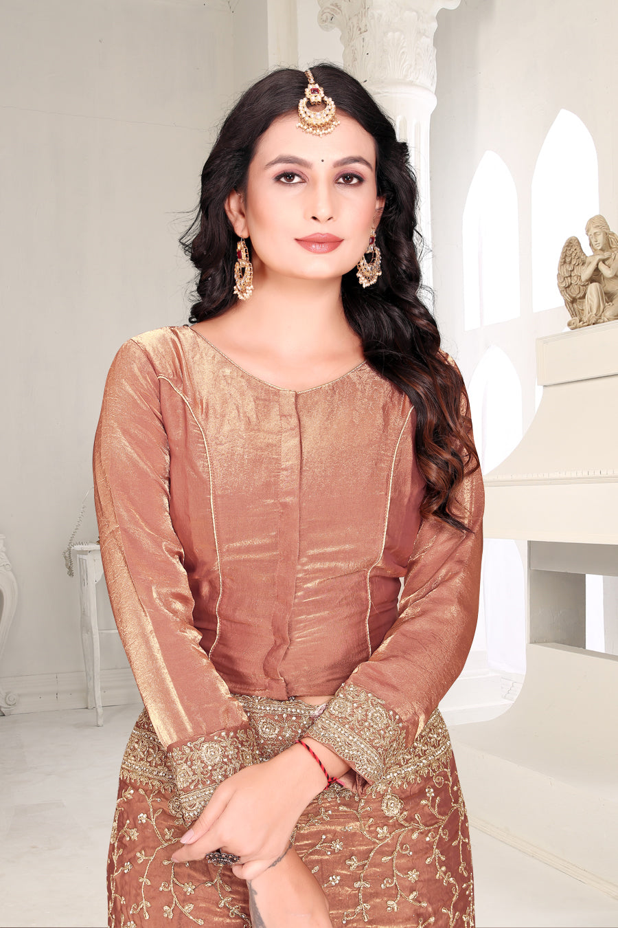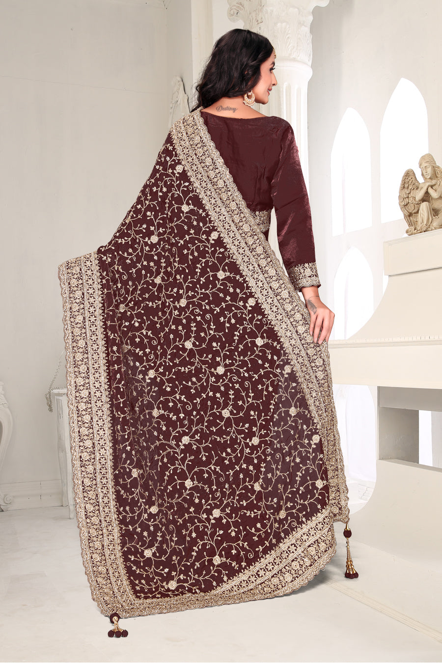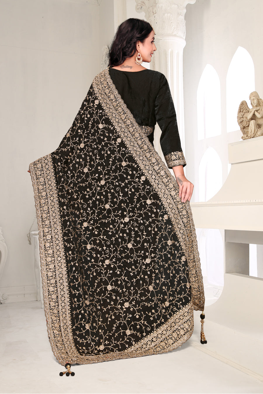The artistry is nothing short of mesmerizing. The smooth satin canvas comes alive with intricate Golden Zari Dori embroidery, woven into hypnotic floral vines. But the true showstopper is the sparkle: we have richly encrusted the embroidery with hand-placed stones that catch the light from every angle. It’s a look of pure, unadulterated glamour—giving you the grandeur of a bridal heirloom with the effortless drape of modern couture.