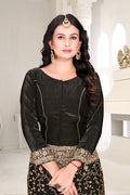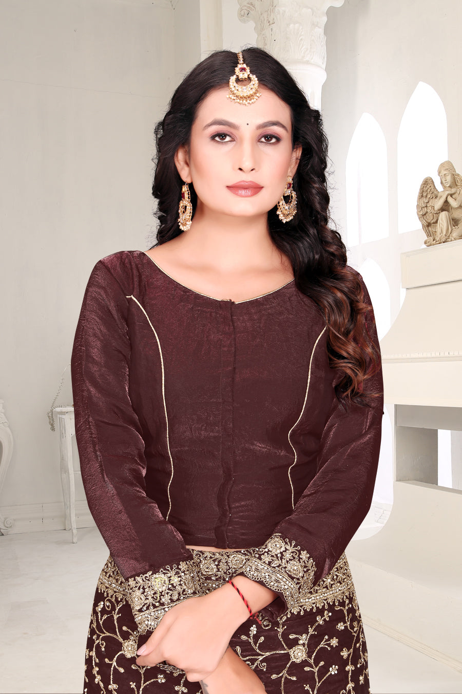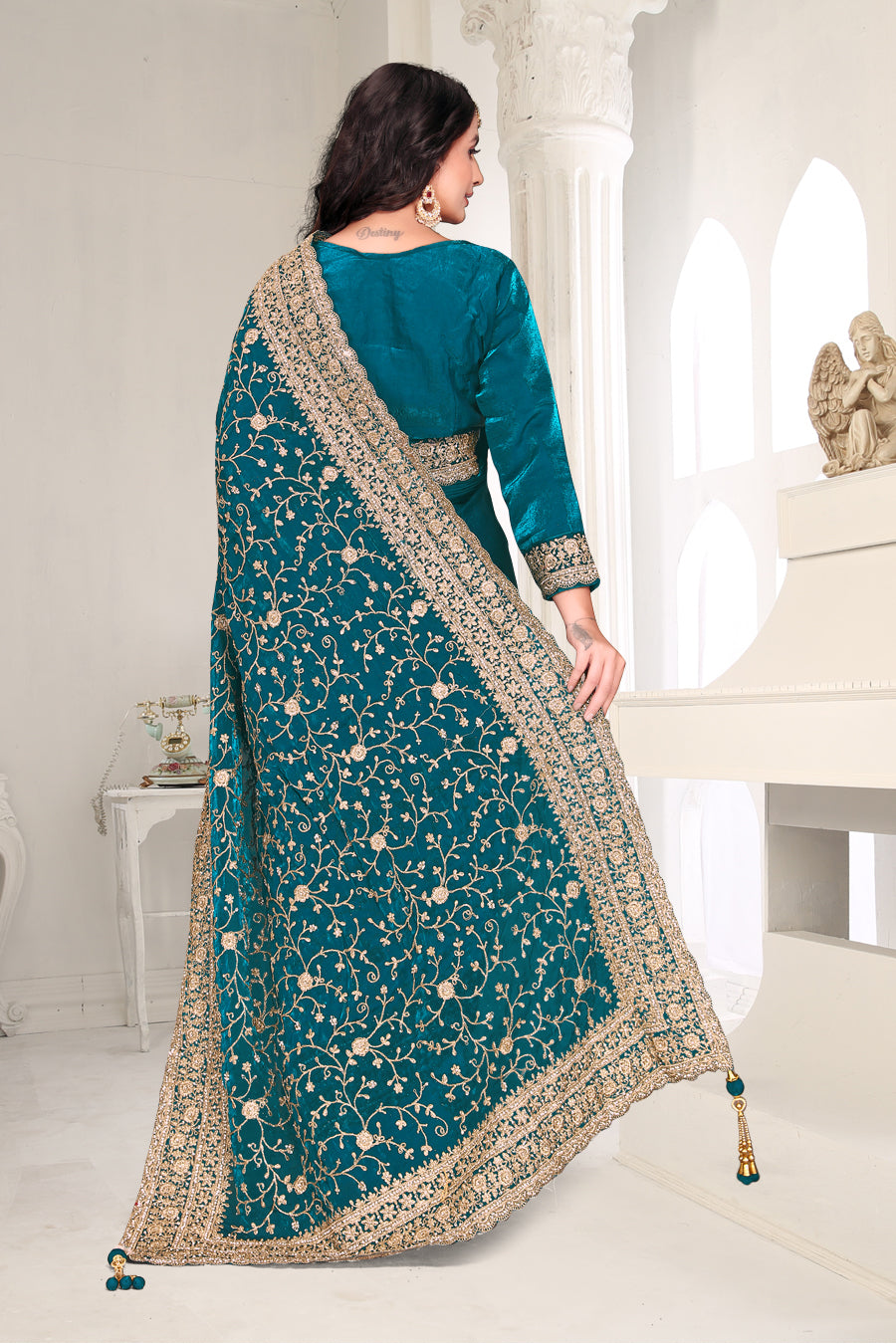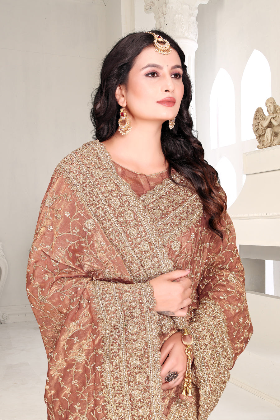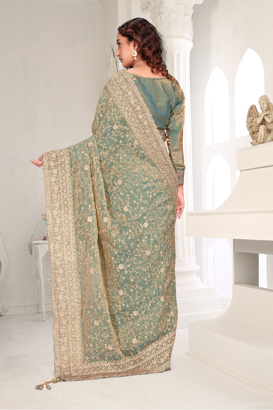 The artistry is nothing short of mesmerizing. The smooth satin canvas comes alive with intricate Golden Zari Dori embroidery, woven into hypnotic floral vines. But the true showstopper is the sparkle: we have richly encrusted the embroidery with hand-placed stones that catch the light from every angle. It’s a look of pure, unadulterated glamour—giving you the grandeur of a bridal heirloom with the effortless drape of modern couture.