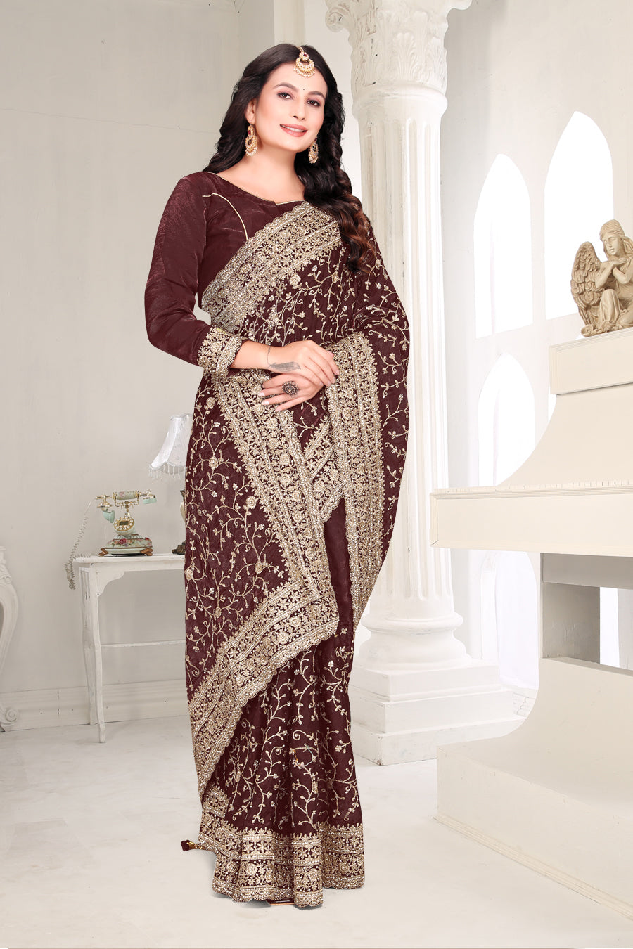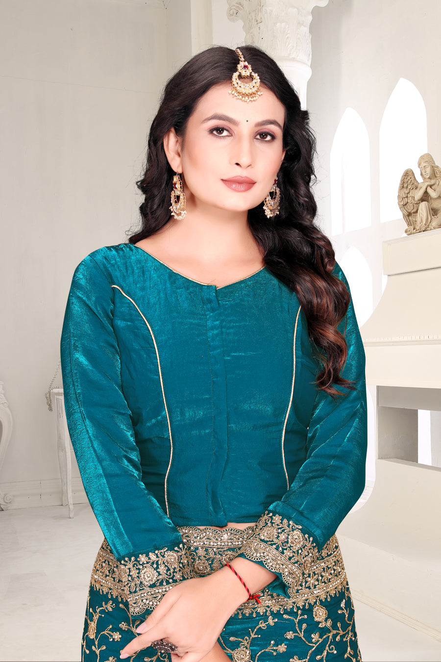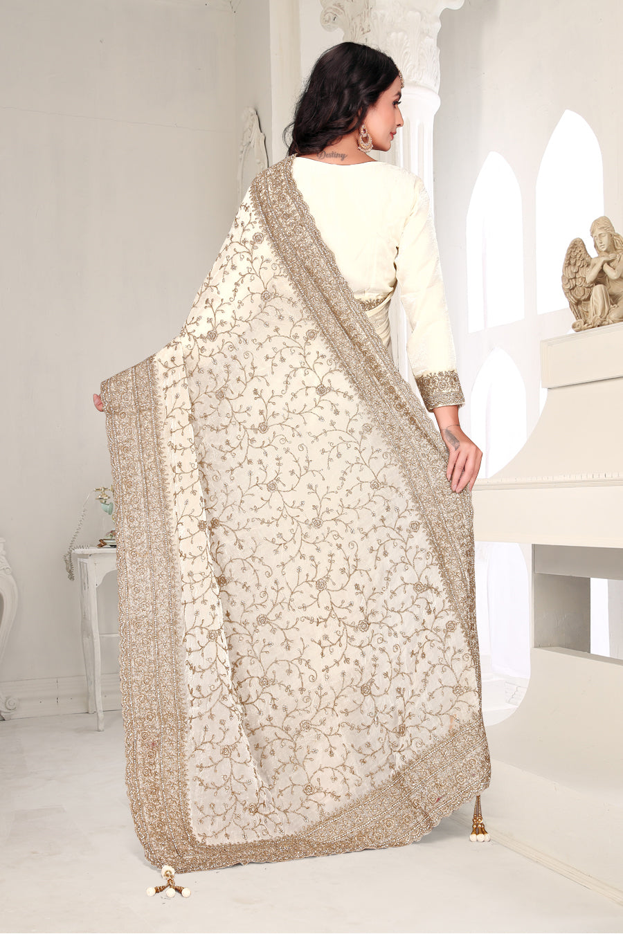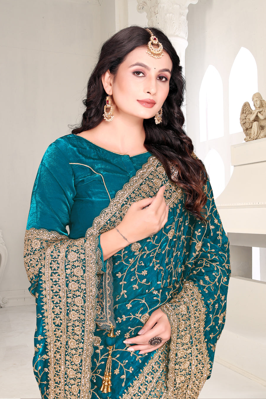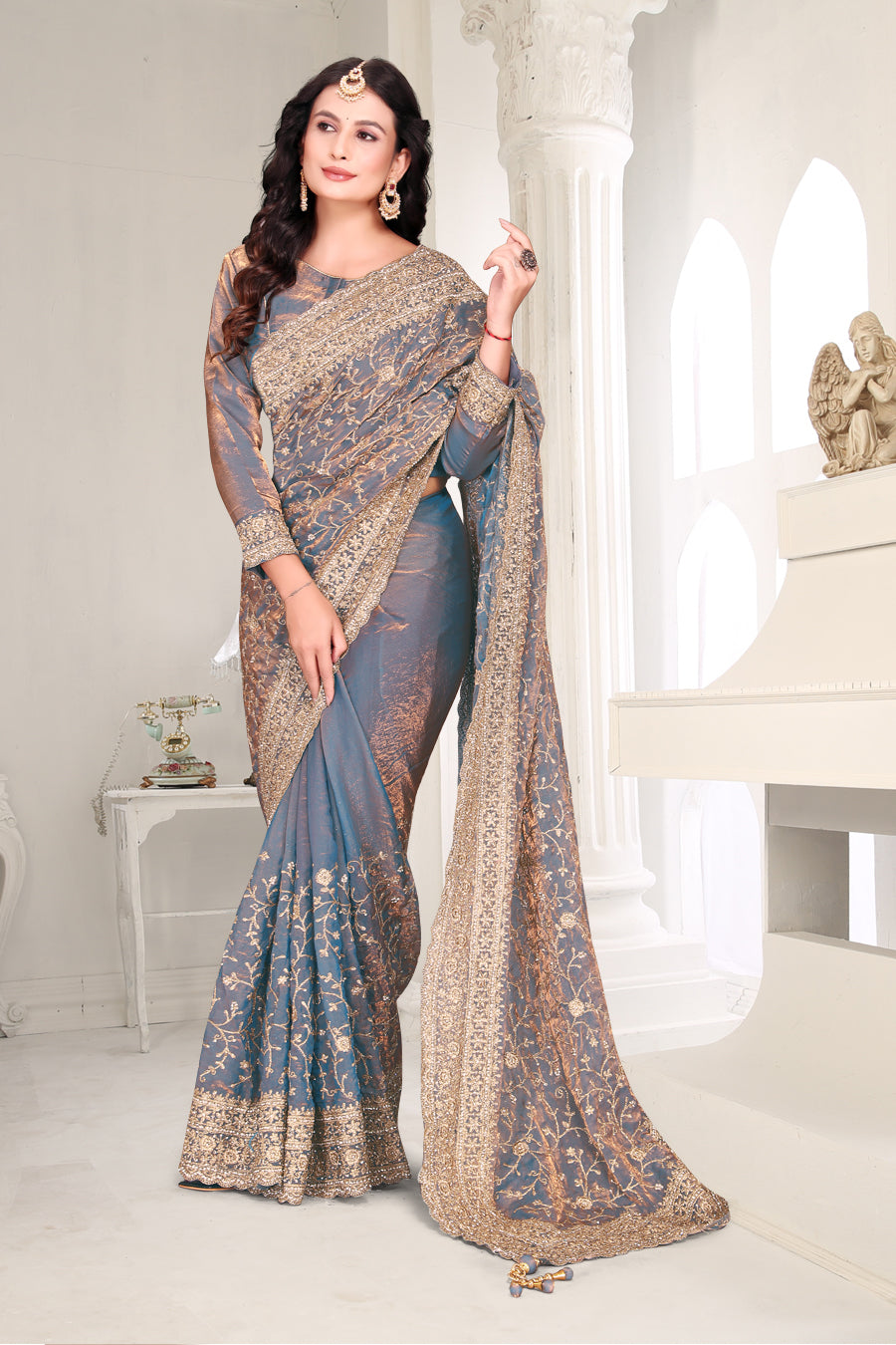 The artistry is nothing short of mesmerizing. The smooth satin canvas comes alive with intricate Golden Zari Dori embroidery, woven into hypnotic floral vines. But the true showstopper is the sparkle: we have richly encrusted the embroidery with hand-placed stones that catch the light from every angle. It’s a look of pure, unadulterated glamour—giving you the grandeur of a bridal heirloom with the effortless drape of modern couture.