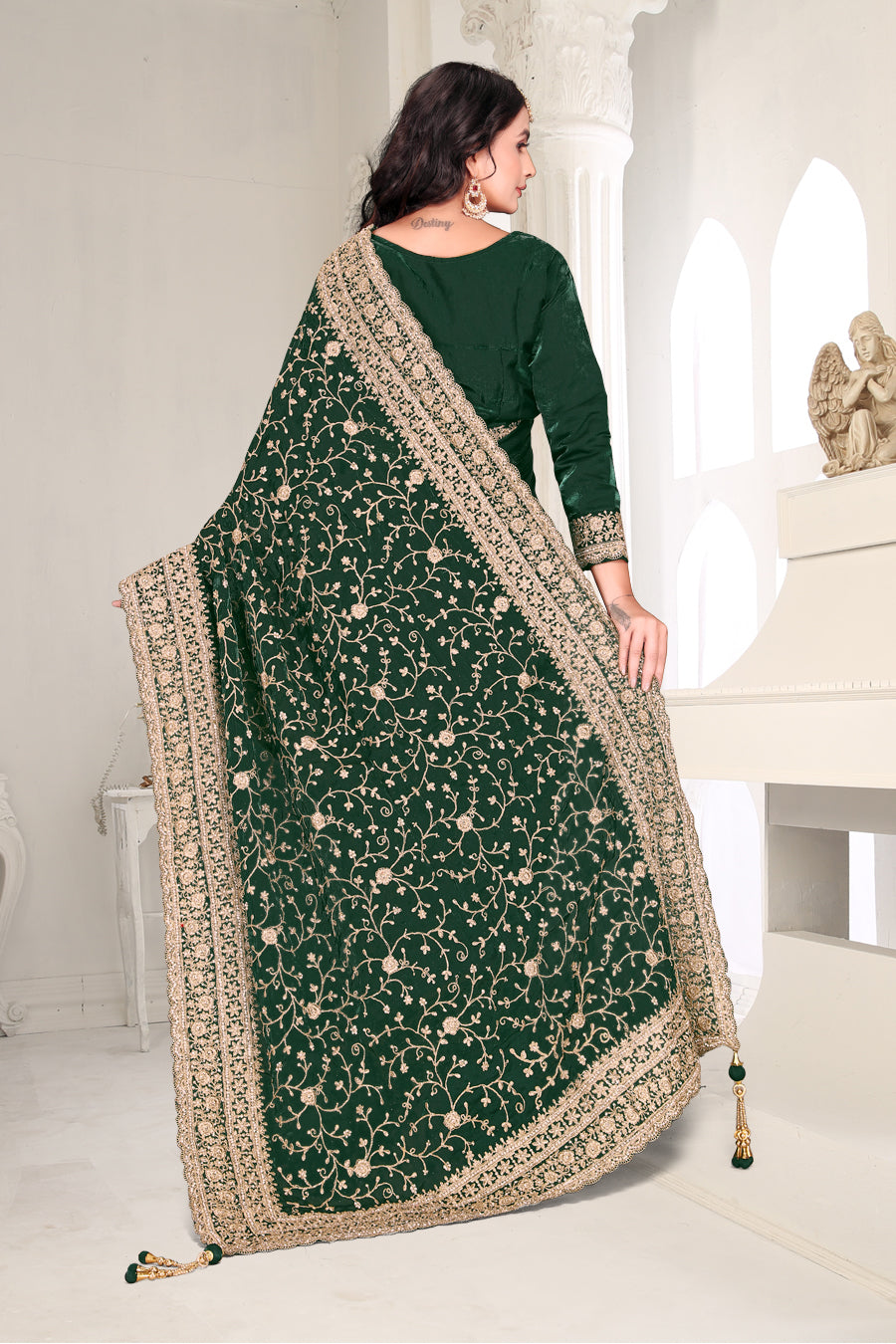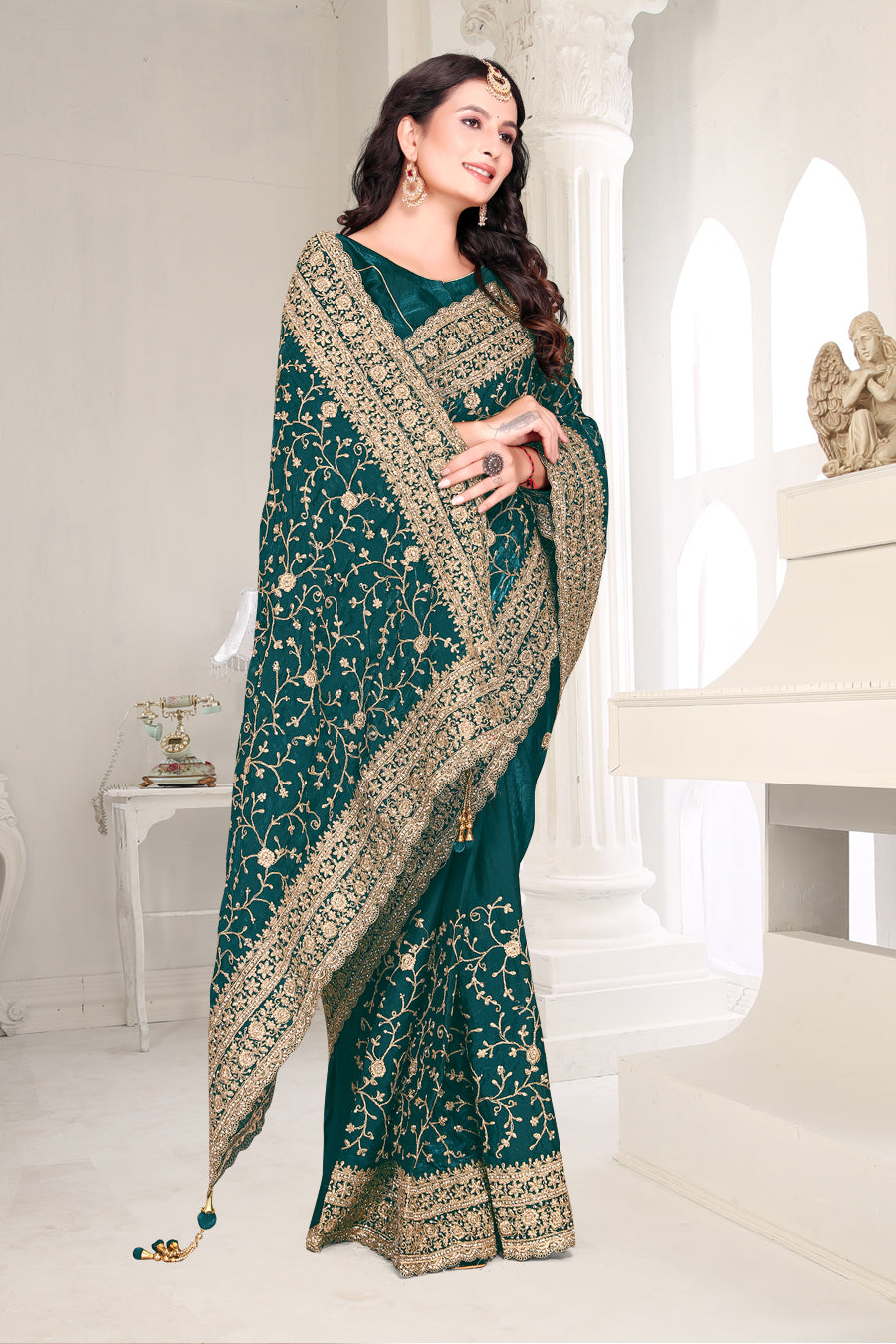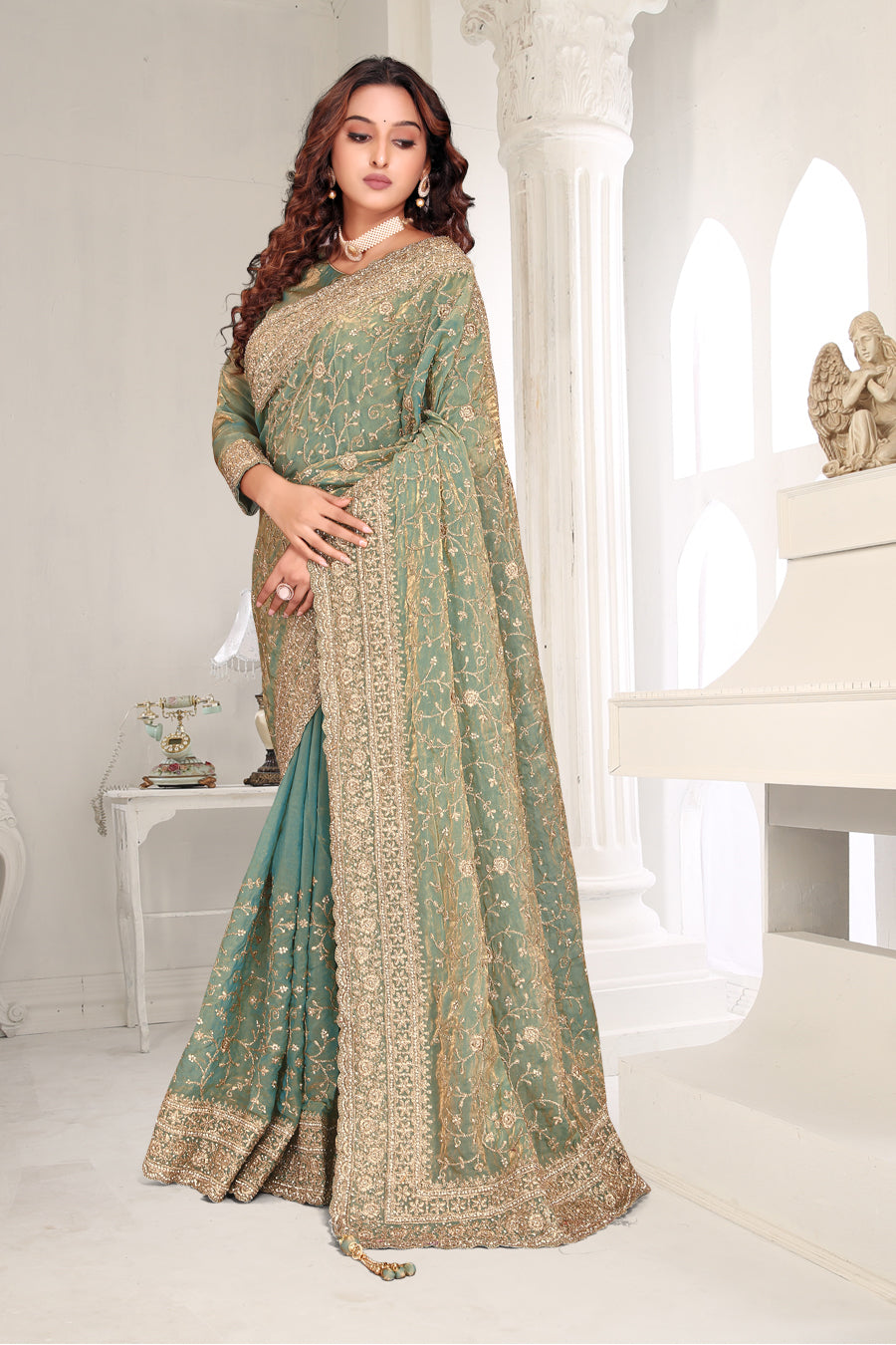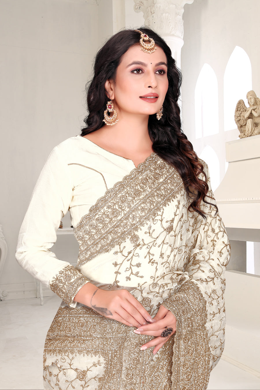 The artistry is nothing short of mesmerizing. The smooth satin canvas comes alive with intricate Golden Zari Dori embroidery, woven into hypnotic floral vines. But the true showstopper is the sparkle: we have richly encrusted the embroidery with hand-placed stones that catch the light from every angle. It’s a look of pure, unadulterated glamour—giving you the grandeur of a bridal heirloom with the effortless drape of modern couture.
