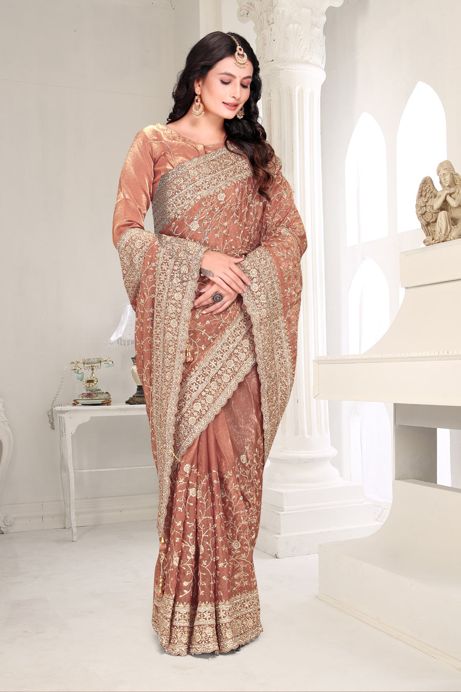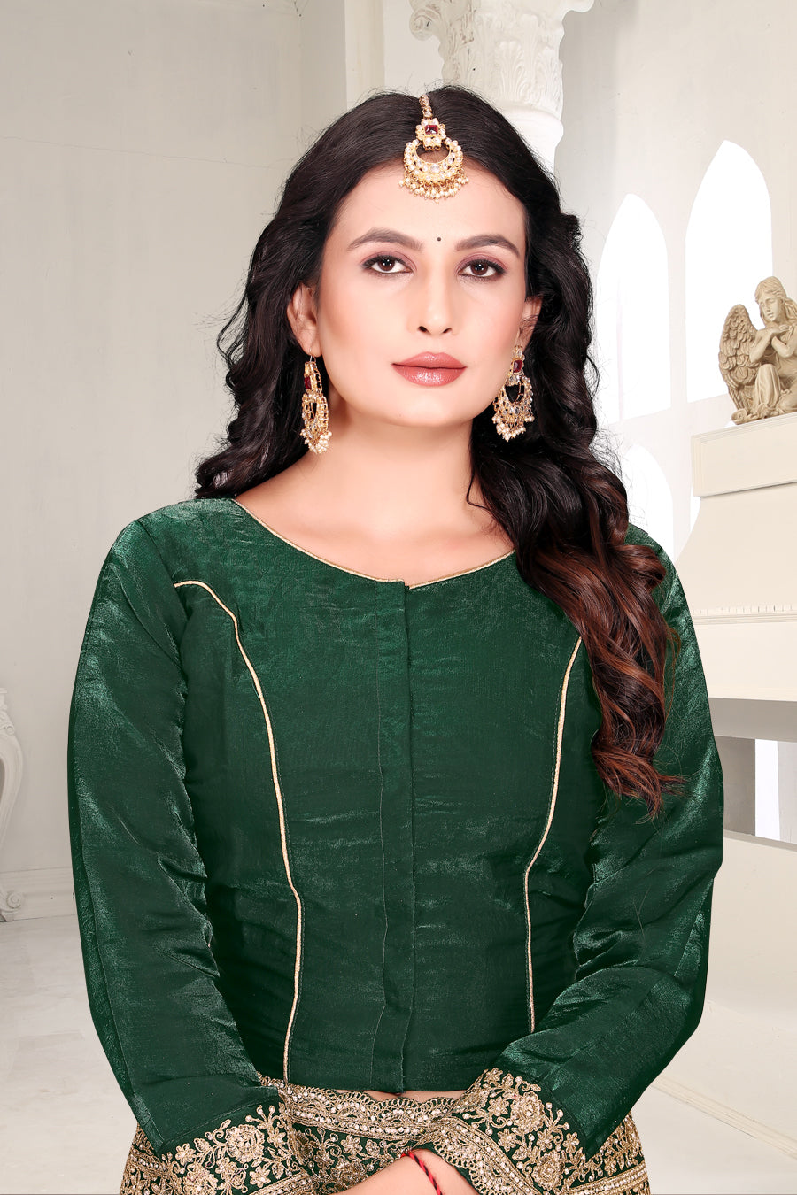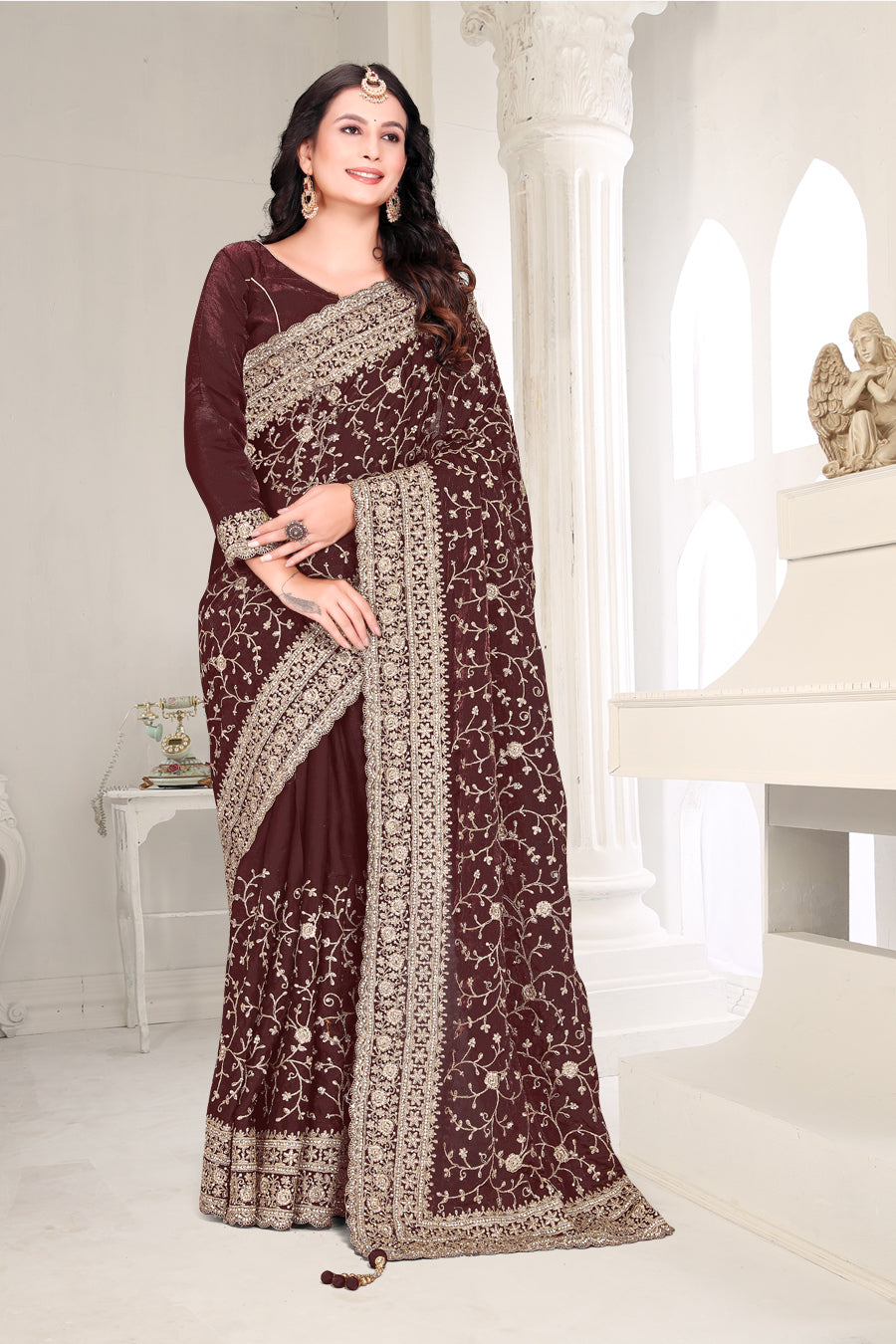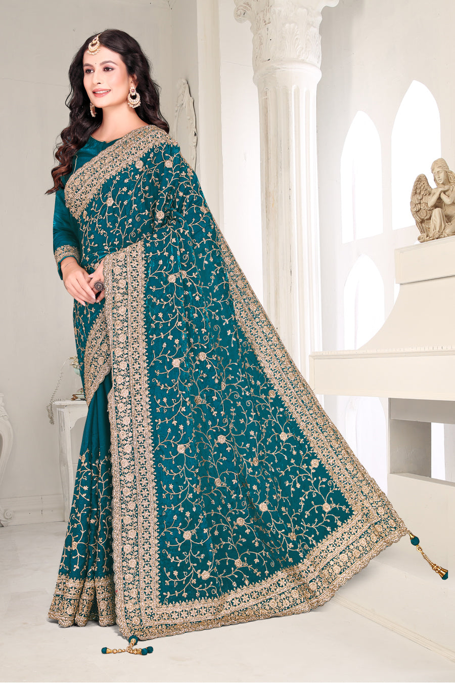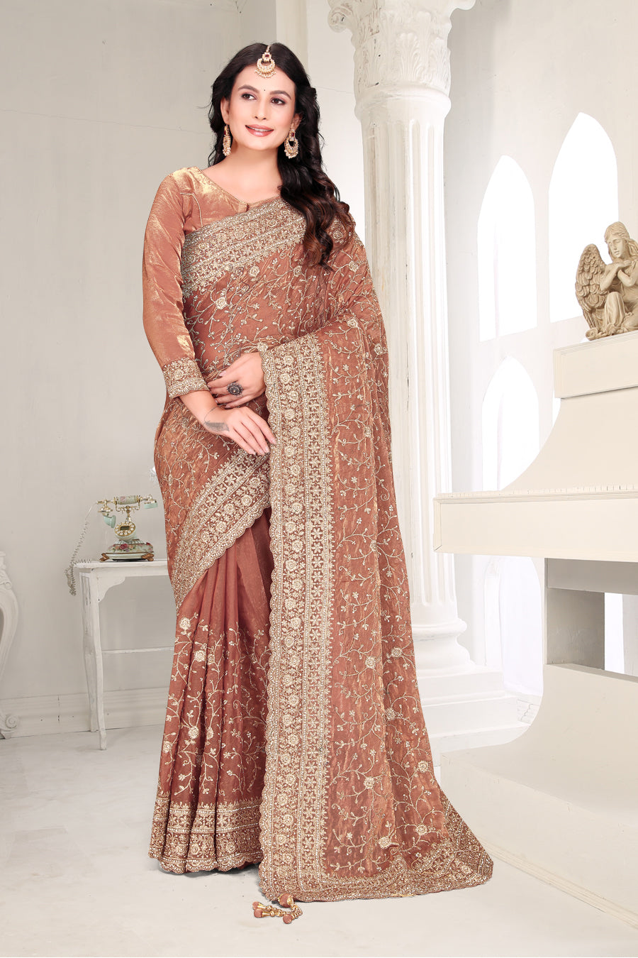 The artistry is nothing short of mesmerizing. The smooth satin canvas comes alive with intricate Golden Zari Dori embroidery, woven into hypnotic floral vines. But the true showstopper is the sparkle: we have richly encrusted the embroidery with hand-placed stones that catch the light from every angle. It’s a look of pure, unadulterated glamour—giving you the grandeur of a bridal heirloom with the effortless drape of modern couture.
