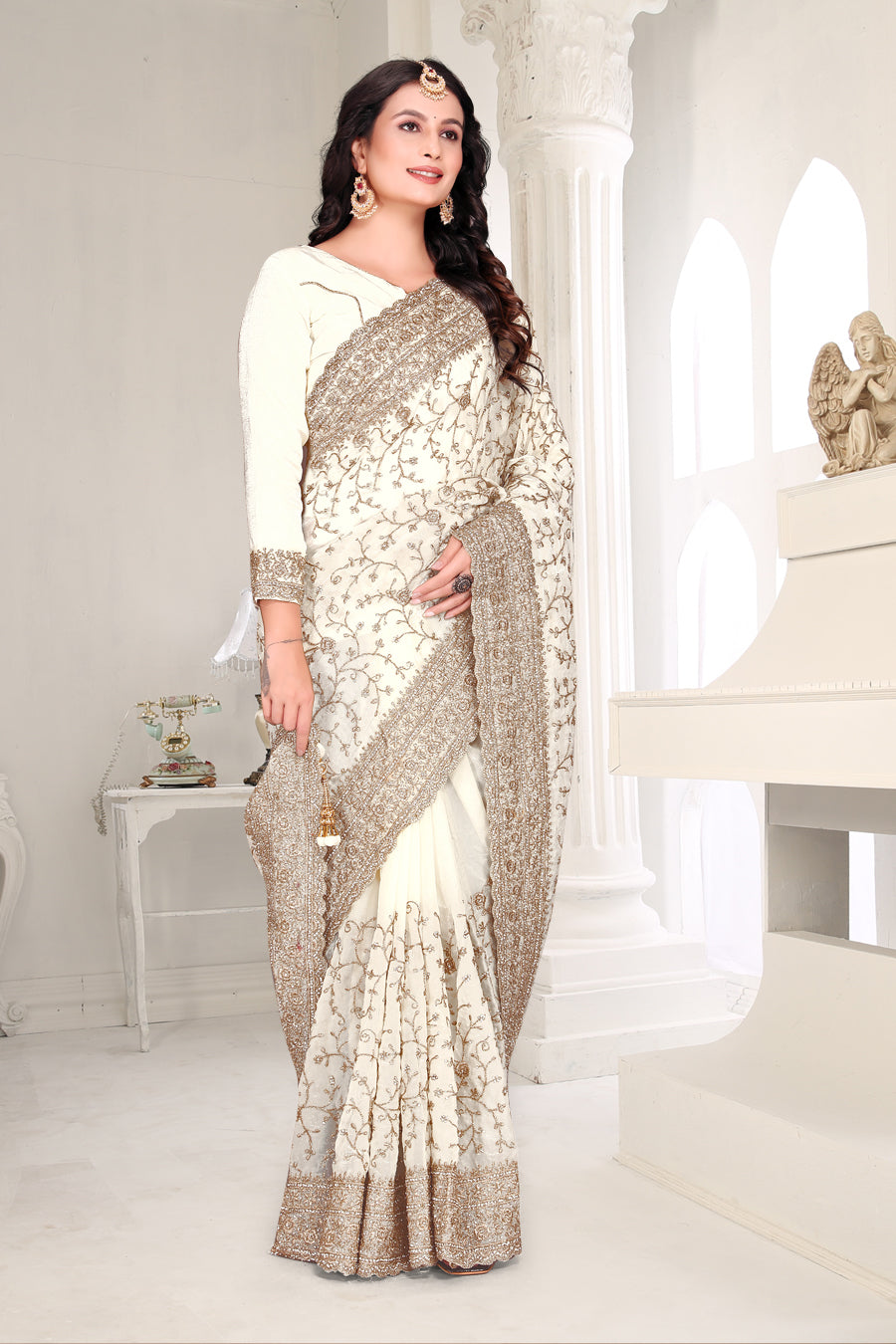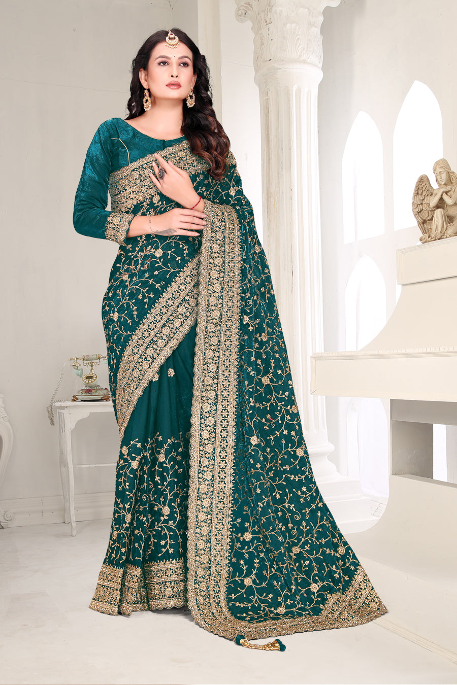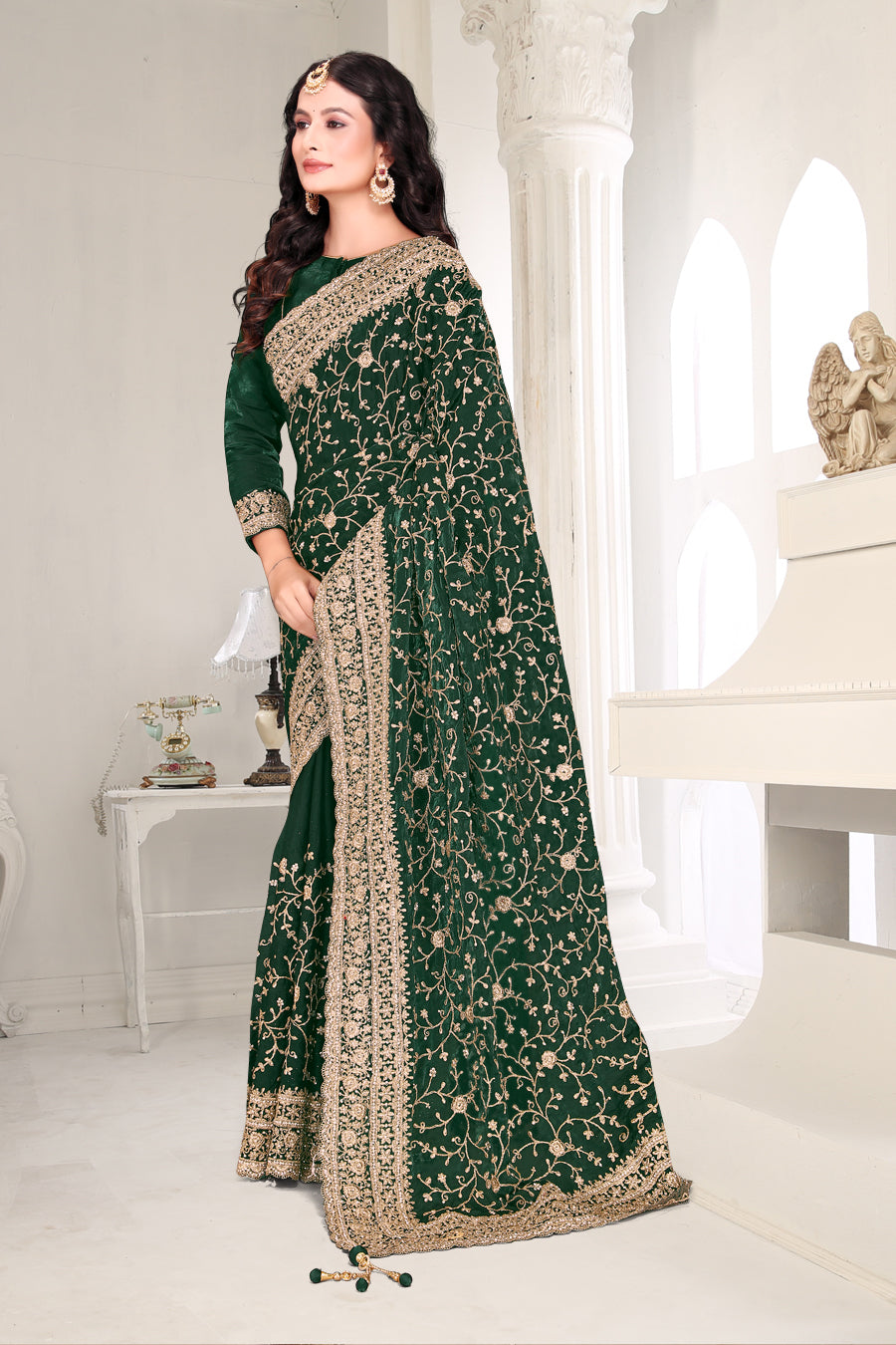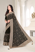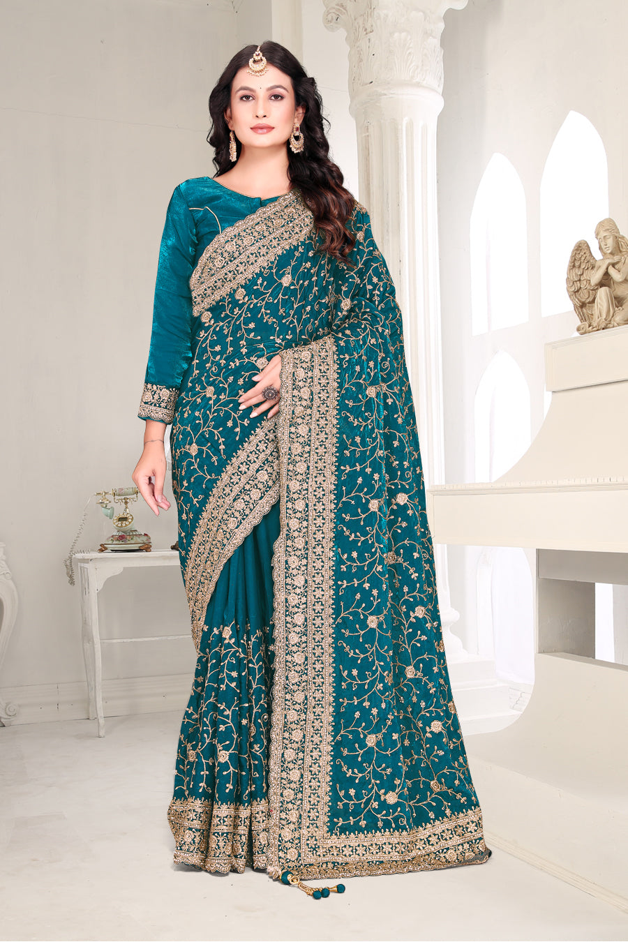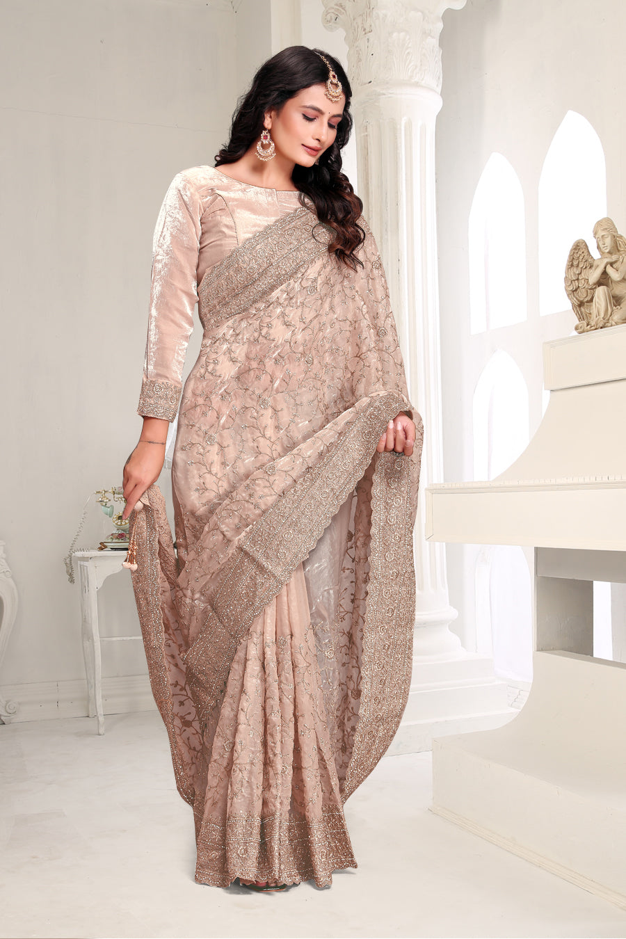 The artistry is nothing short of mesmerizing. The smooth satin canvas comes alive with intricate Golden Zari Dori embroidery, woven into hypnotic floral vines. But the true showstopper is the sparkle: we have richly encrusted the embroidery with hand-placed stones that catch the light from every angle. It’s a look of pure, unadulterated glamour—giving you the grandeur of a bridal heirloom with the effortless drape of modern couture.