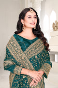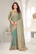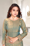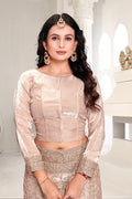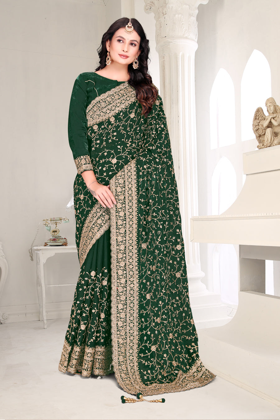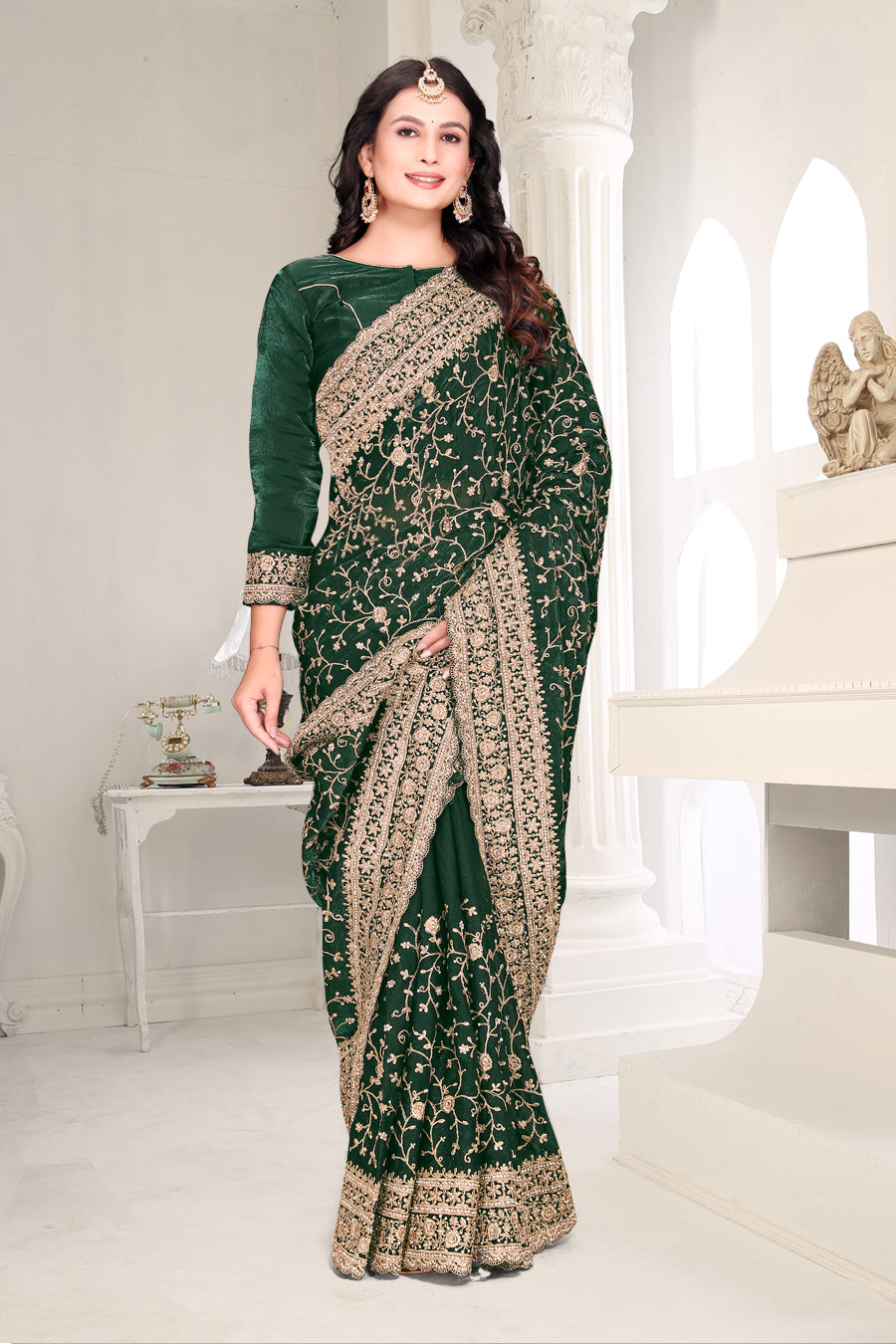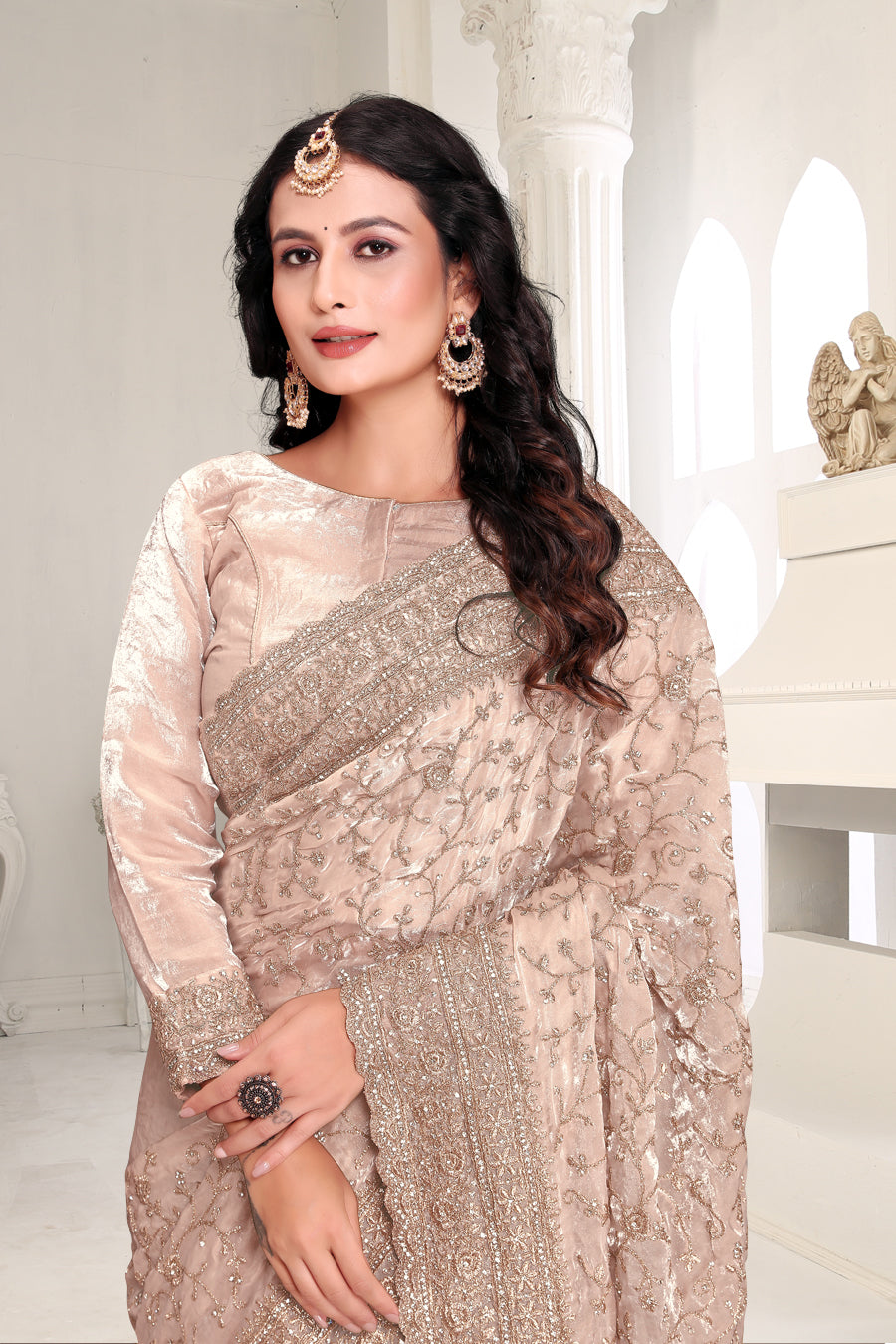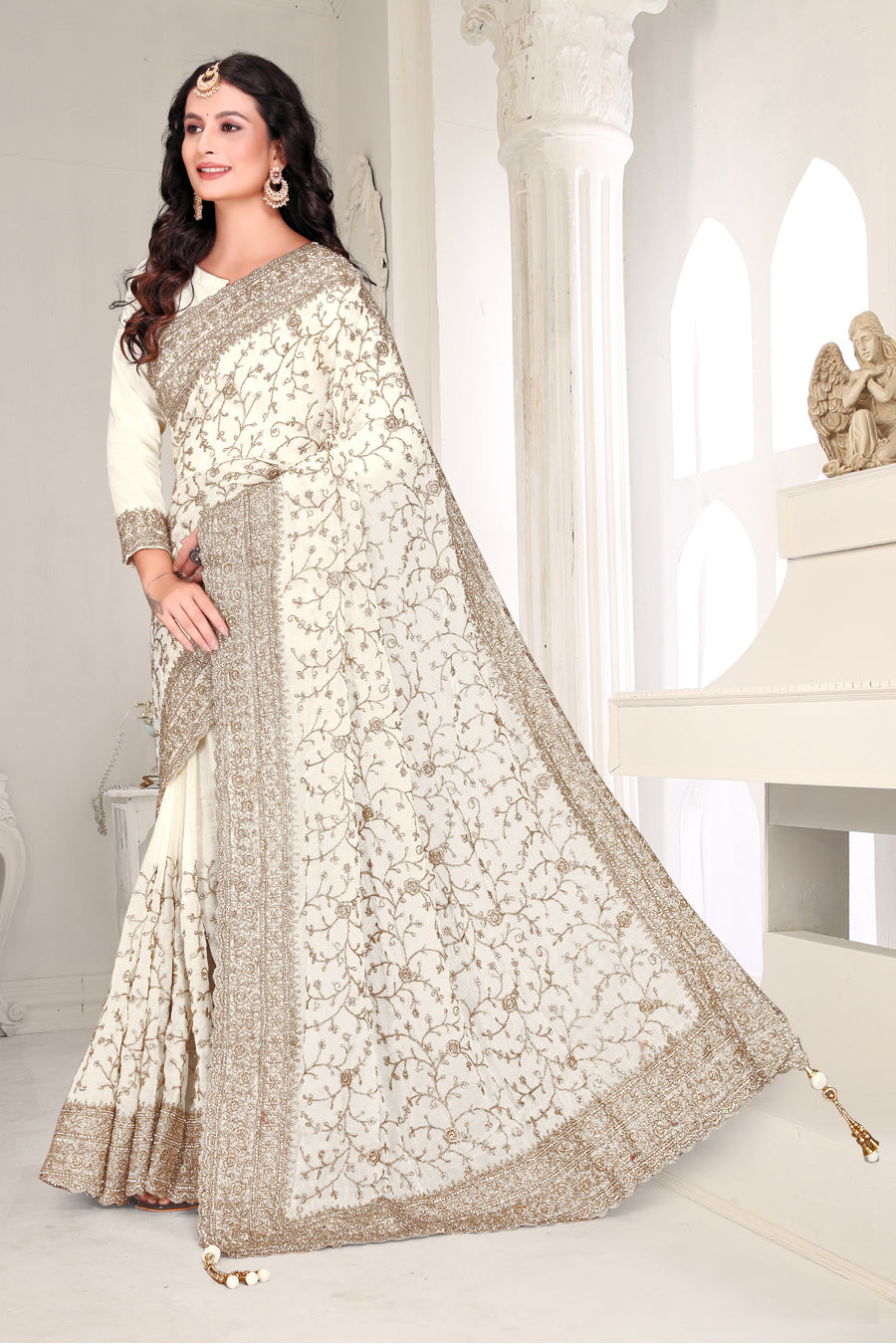 The artistry is nothing short of mesmerizing. The smooth satin canvas comes alive with intricate Golden Zari Dori embroidery, woven into hypnotic floral vines. But the true showstopper is the sparkle: we have richly encrusted the embroidery with hand-placed stones that catch the light from every angle. It’s a look of pure, unadulterated glamour—giving you the grandeur of a bridal heirloom with the effortless drape of modern couture.
