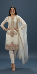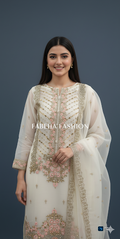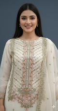 Immerse yourself in the breathtaking beauty of this ivory premium organza kameez, a canvas of elaborate artistry. The front features a mesmerizing display of intricate gold and delicate pink embroidery, meticulously crafted with shimmering sequins, pearls, and zari work. The elegant V-neckline is adorned with dazzling embellishments, leading into a bodice that radiates sophistication with its symmetrical patterns. Long, sheer organza sleeves boast subtle embroidery at the cuffs, adding a touch of grace.