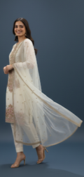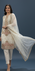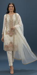 Complementing the majestic kameez are perfectly tailored ivory trousers crafted from a premium, comfortable fabric. Their sleek design ensures a flattering silhouette, providing balance to the richly adorned tunic. The subtle sheen of the fabric adds to the luxurious appeal, creating a cohesive and polished look.