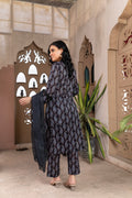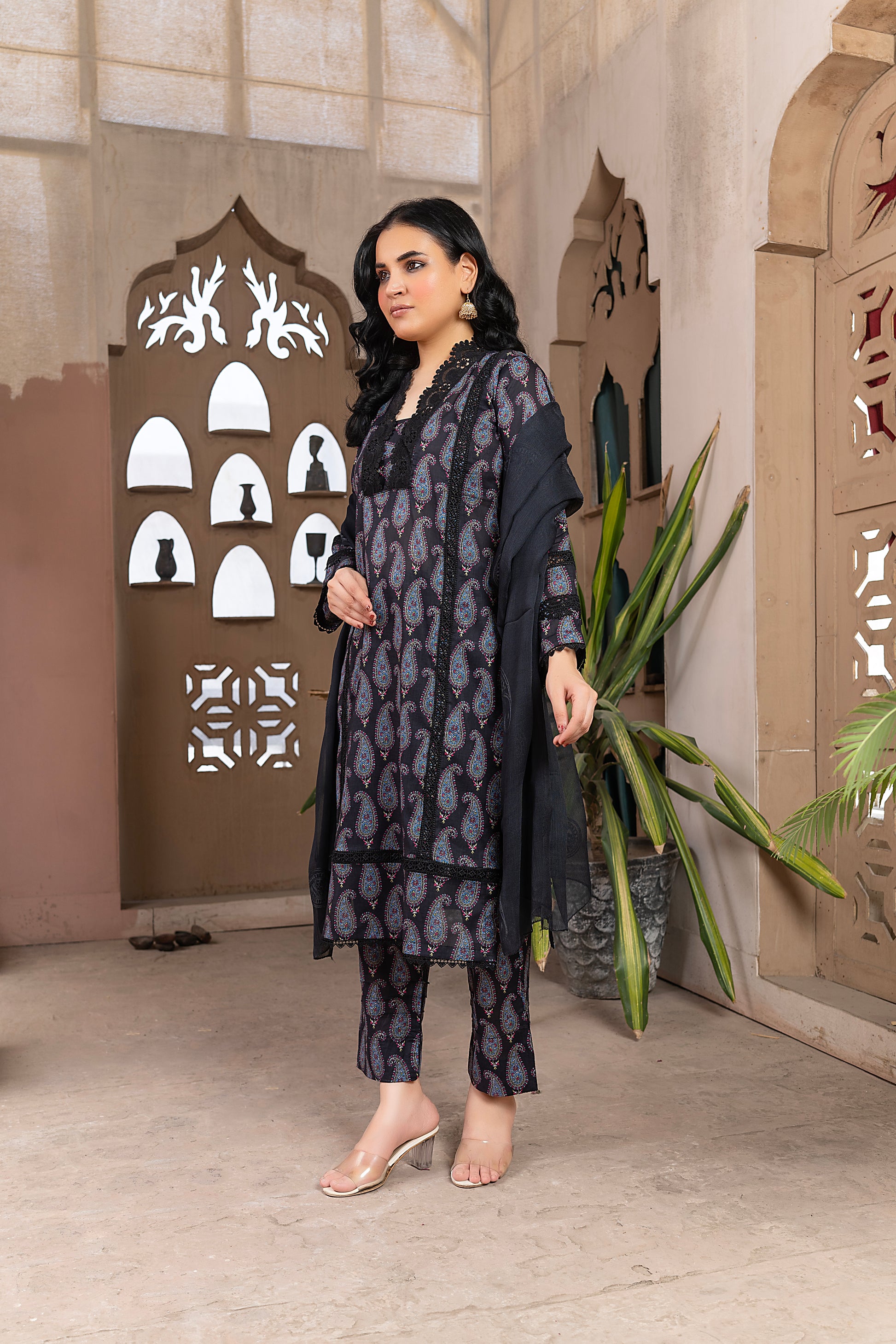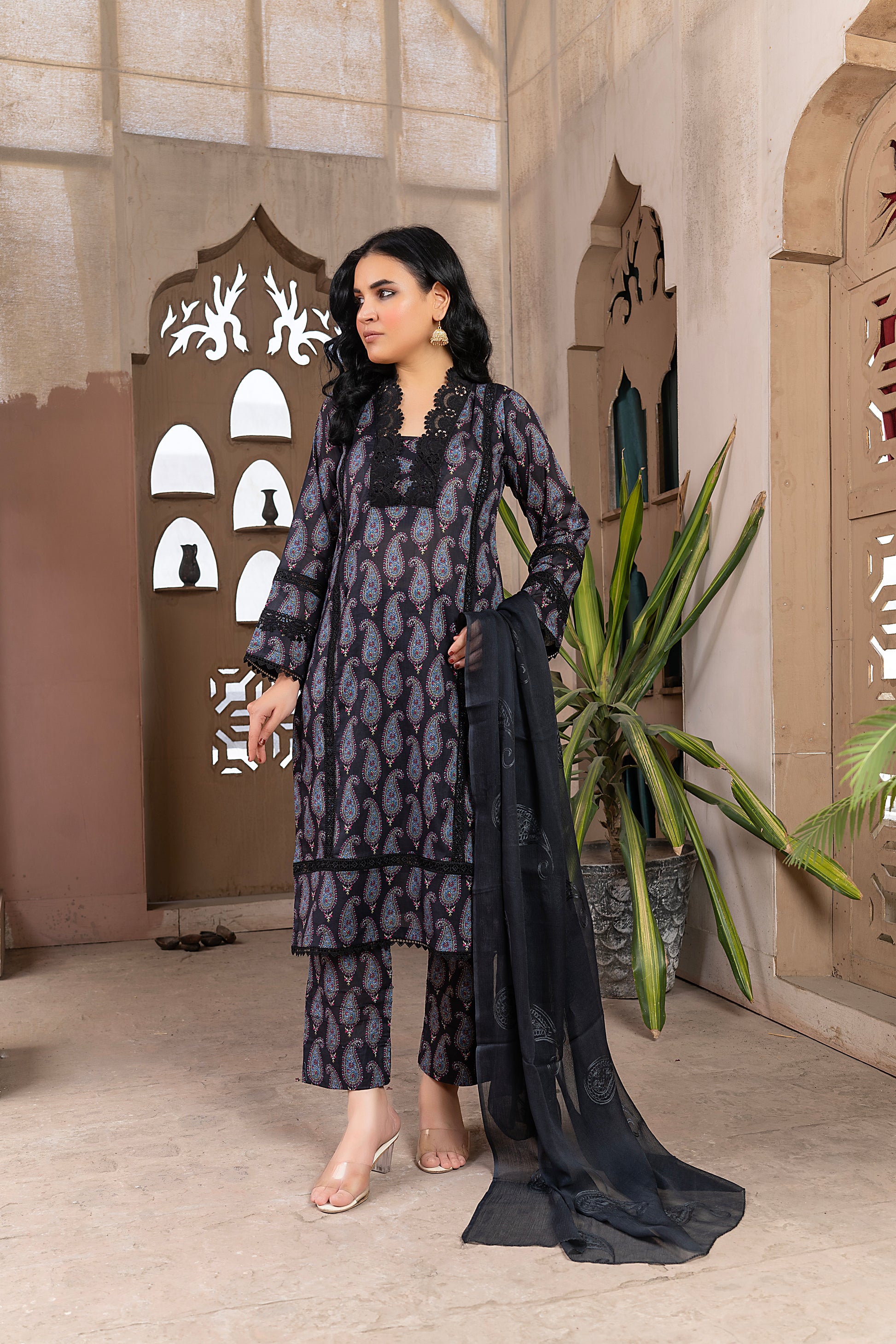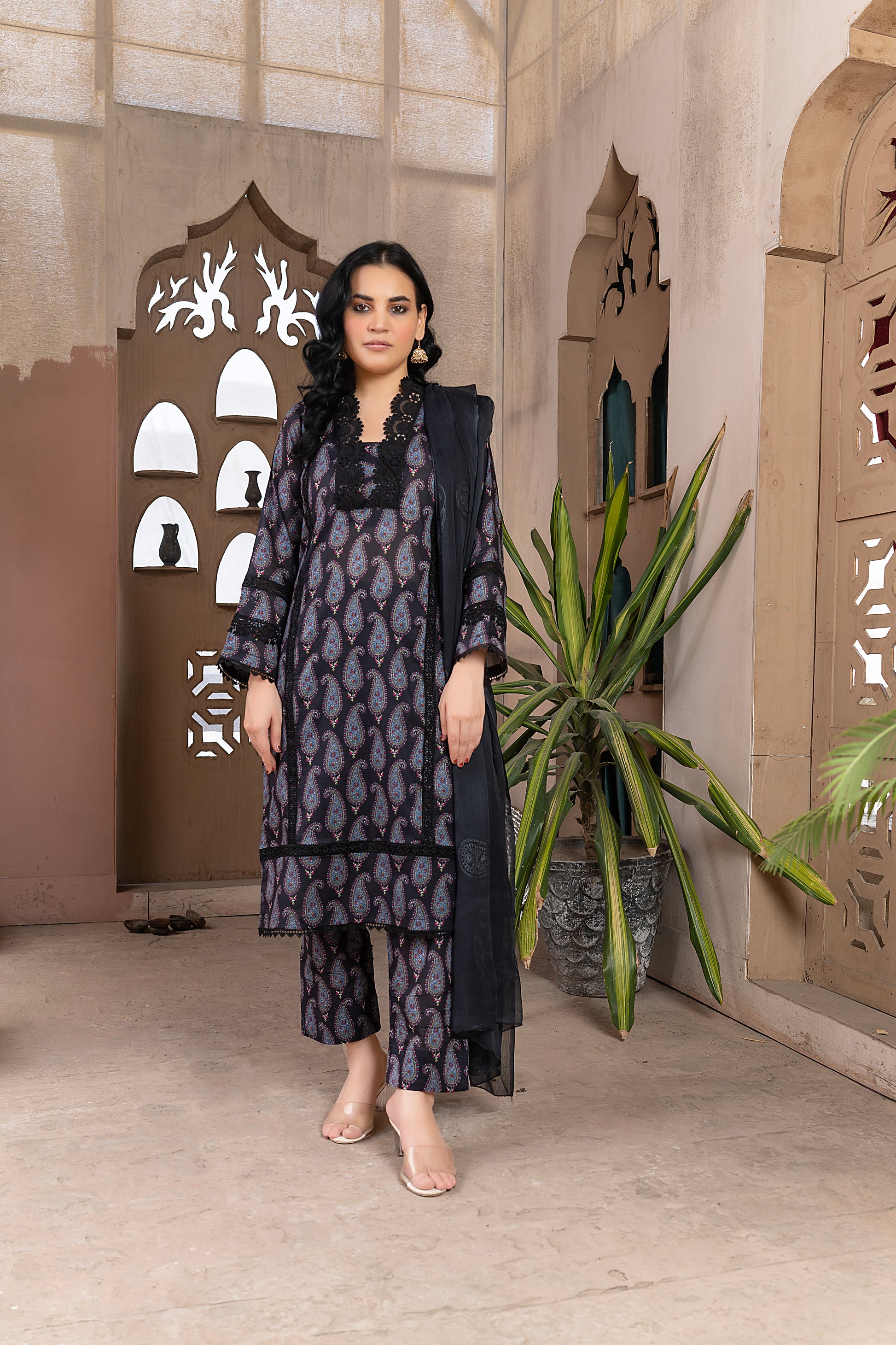 Summer chic unleashed! Radiate confidence in our premium cotton lawn suit. Step into the spotlight with this breathtaking ensemble, designed to turn heads and capture hearts. Experience the perfect blend of coolness and comfort, ideal for sun-drenched days and enchanting evenings. The vibrant paisley print dances across the fabric, an artistic symphony of rich colors that embodies the spirit of the season. The intricate black lace detailing on the neckline, sleeves, and hemline adds unparalleled elegance and sophistication. The elasticated waistband ensures a custom, comfortable fit, while the luxurious chiffon dupatta features self-thread embroidered motifs scattered all over, completing your captivating look. This isn't just a suit, it's an experience, a must-have for your summer wardrobe, perfect for any special occasion.