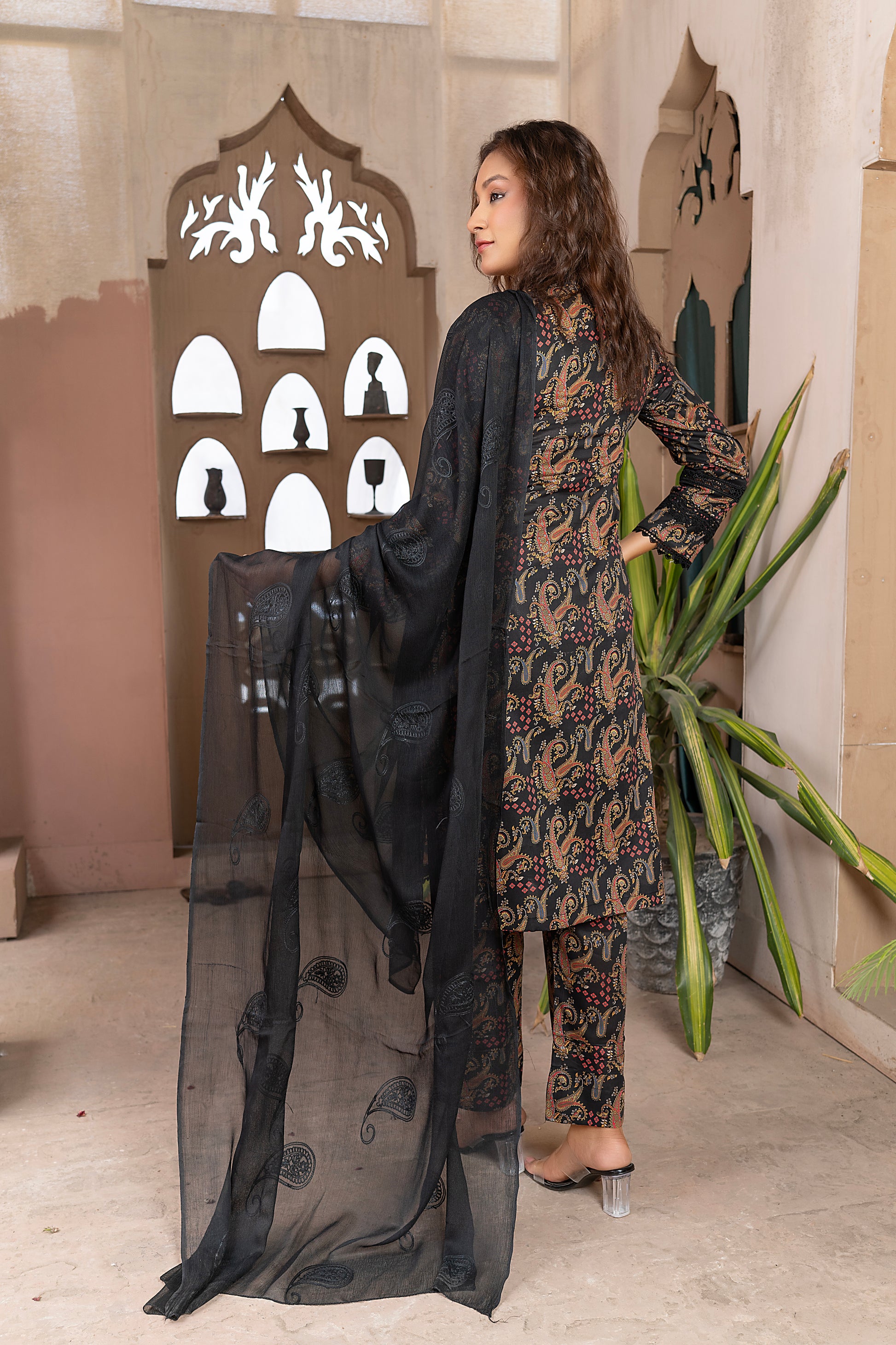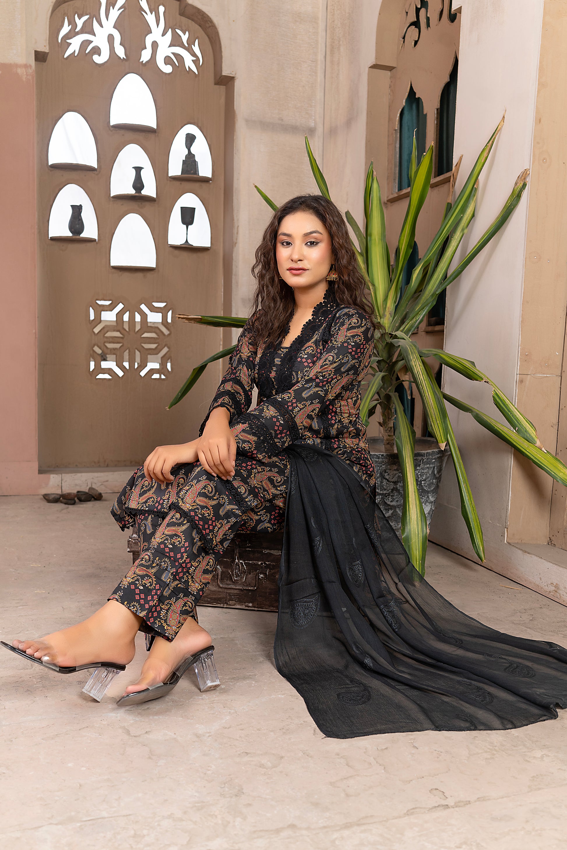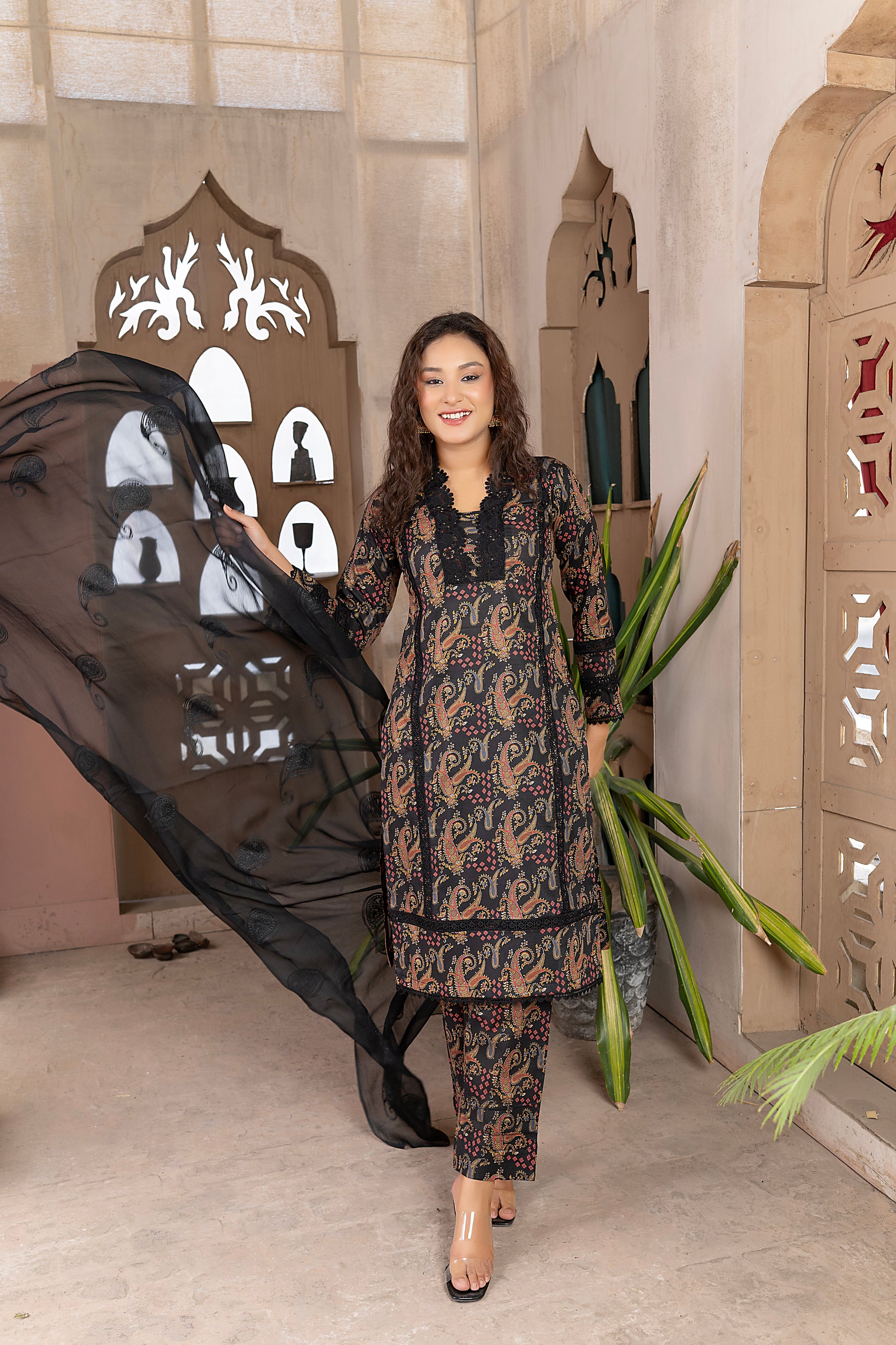 Summer chic unleashed! Radiate confidence in our premium cotton lawn suit. Step into the spotlight with this breathtaking ensemble, designed to turn heads and capture hearts. Experience the perfect blend of coolness and comfort, ideal for sun-drenched days and enchanting evenings. The vibrant floral paisley print dances across the fabric, an artistic symphony of rich colors that embodies the spirit of the season. The unique neckline features delicate black lace detailing, adding an unparalleled touch of elegance and sophistication. The straight trousers with an elasticated waist ensure a custom, comfortable fit that moves with you, allowing you to breeze through your day with absolute ease. To complete this divine look, a luxurious chiffon dupatta features charming paisley embroidery scattered all over, adding a whisper of refinement and completing your ensemble with captivating allure. This isn't just a suit, it's an experience, and a must-have for your summer wardrobe, perfect for any special occasion!