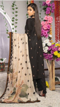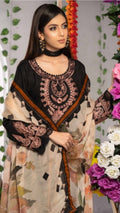 The suit is grounded in a deep, classic Onyx Black hue. The fabric of the kameez and trousers is Premium Winter Lux Linen, offering a substantial, warm feel and a beautiful drape, ideal for the winter season. The long-line kameez is adorned with intricate Dori and Resham embroidery in a luxurious Rose Gold tone, highlighting the neckline, front panels, and hem. The hem is finished with delicate black cutwork lace and small hanging black beads/pearls. A beautiful, digitally printed chiffon-blend dupatta provides a striking contrast, featuring a modern, abstract print in shades of beige, black, white, and golden-yellow, perfectly balancing the classic embroidery.