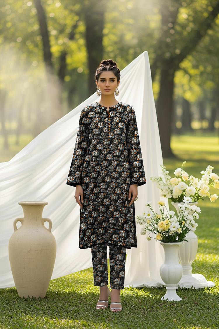The straight-cut kameez features a mesmerizing digital print that truly sets this outfit apart. The print showcases a dense floral pattern in captivating shades of crisp white, burnt orange (or rust), and warm grey set against a deep black (or charcoal) background. This is not just a pattern; it's a piece of wearable art, designed using high-definition technology to ensure crisp lines and vivid colors that won't fade. The premium quality tailoring ensures a perfect drape and finish. The neckline features a decorative trim and mustard/gold-tone buttons down the placket (visible in the close-up image).