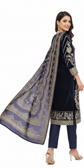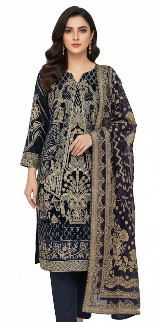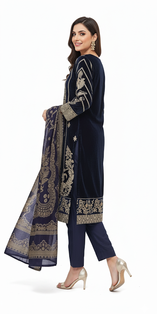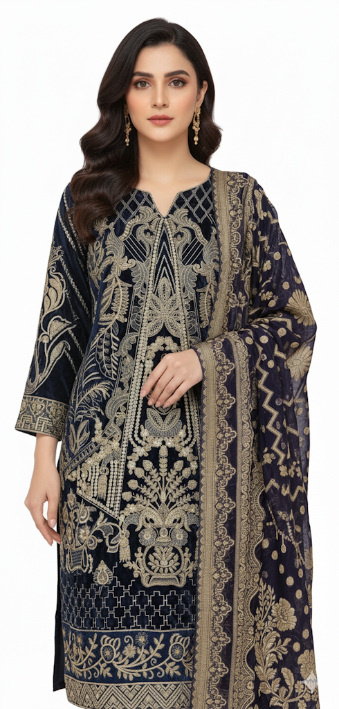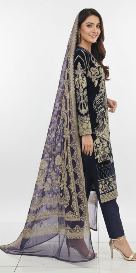 Step into an aura of opulent elegance with our exquisite Royal Navy Sapphire Velvet Embroidered 3-Piece Suit. Crafted to perfection, this ensemble is a symphony of luxurious velvet in a deep, enchanting shade reminiscent of a winter night sky, paired with intricate golden embroidery. Designed for the woman who commands attention, it effortlessly blends traditional artistry with contemporary grace. Feel the soft embrace of rich fabric as you adorn a piece that promises comfort without compromising on breathtaking style. Ideal for festive occasions, elegant gatherings, or making a grand statement, this suit ensures you shine as the true centerpiece of any event. Let every stitch tell a story of heritage and sophistication.