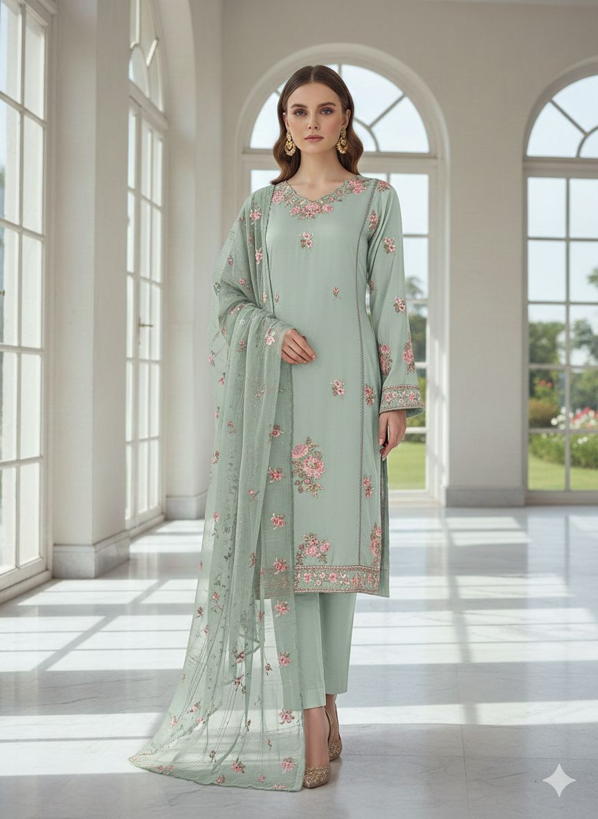 Elevate your wardrobe with this sophisticated premium linen suit, expertly crafted for modern elegance. The ensemble features an intricately embroidered dress paired with a coordinating dupatta, offering versatile styling for both formal occasions and refined everyday wear. Linen's natural breathability and lightweight construction ensure comfort throughout the day, while the detailed embroidery adds a distinctive touch of artisanal craftsmanship. This ready-to-wear piece combines traditional design sensibilities with contemporary silhouettes, making it an essential addition for those who appreciate quality fabrics and thoughtful detailing.