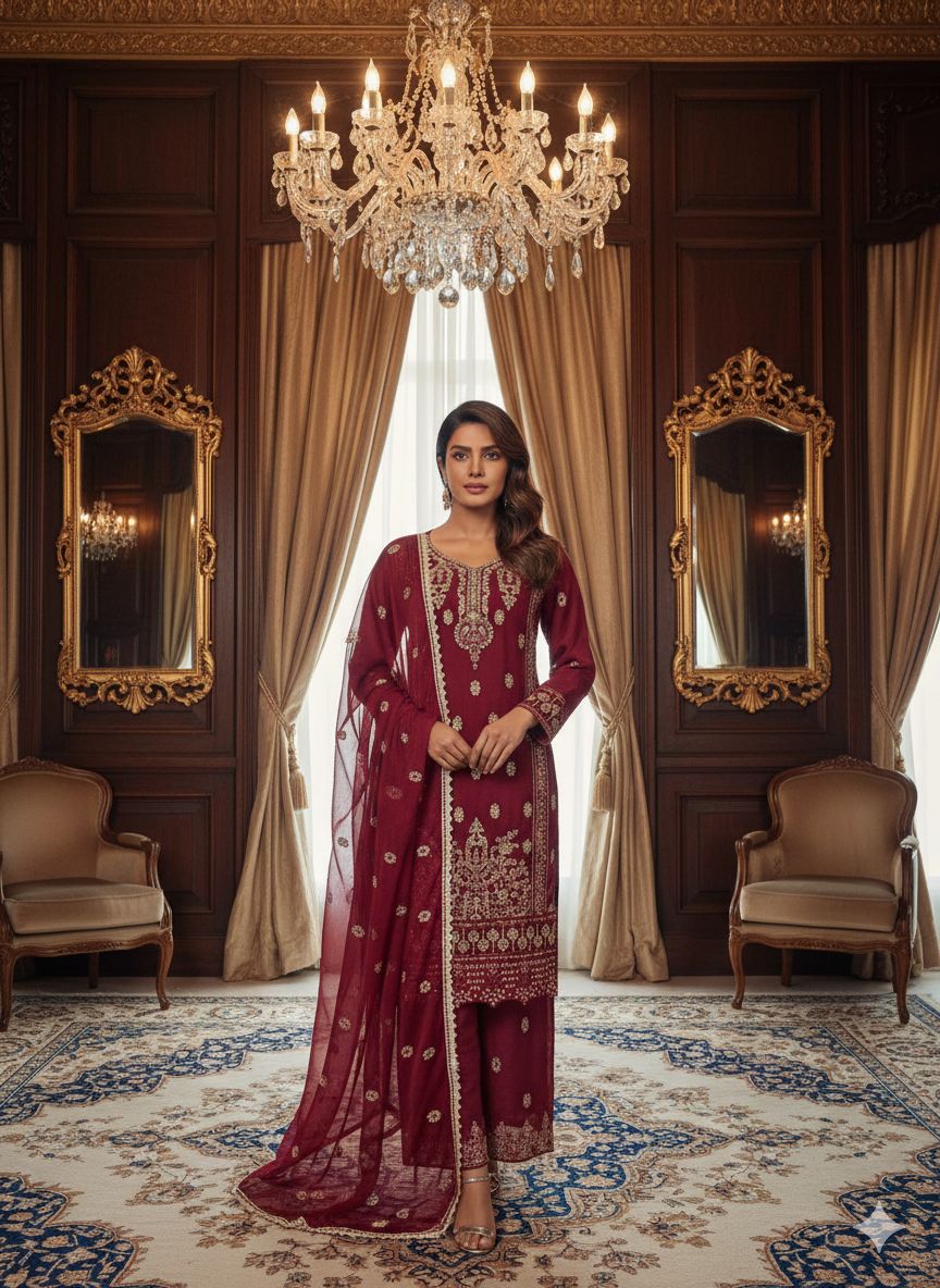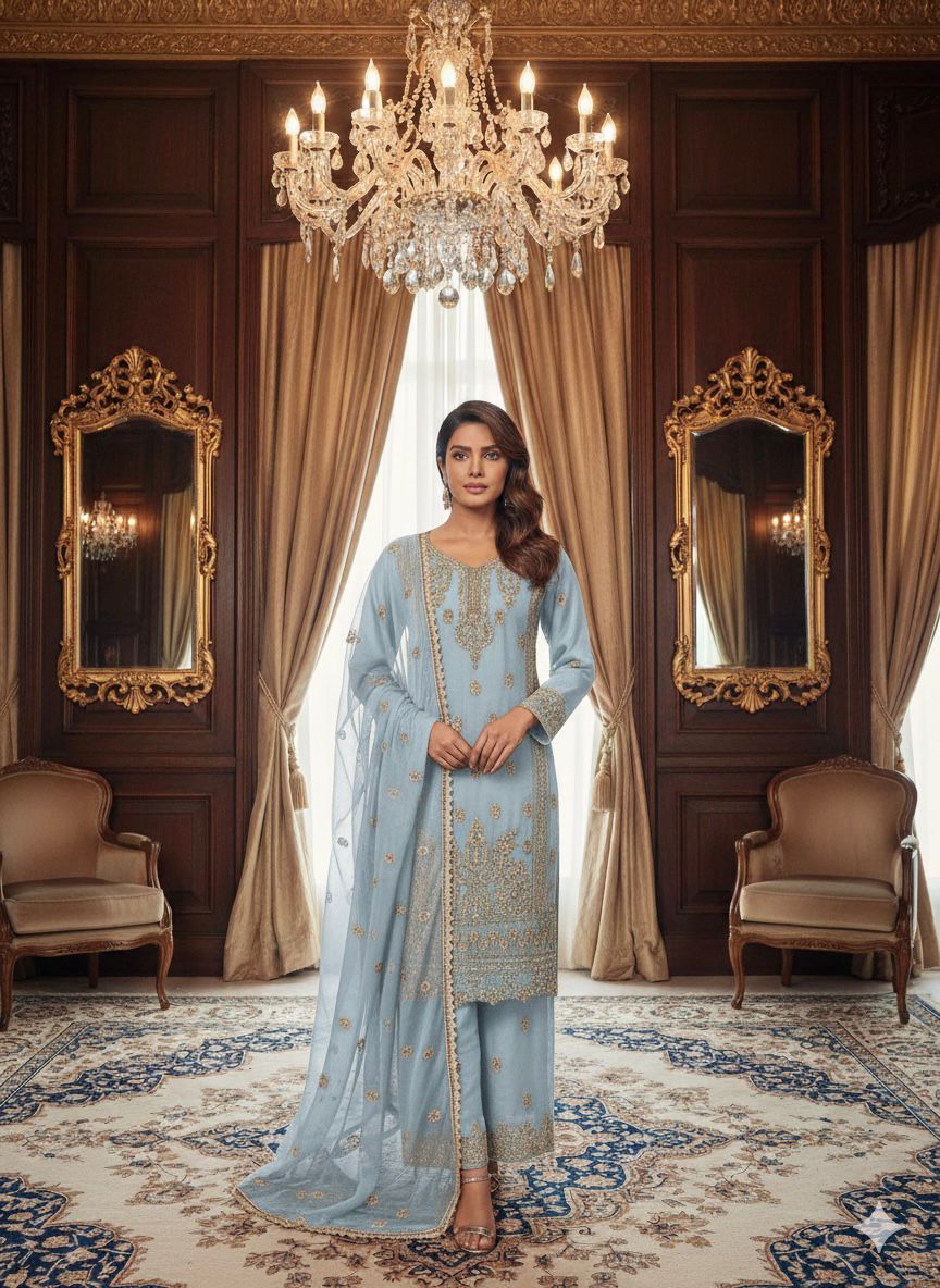 Elevate your ethnic wardrobe with this exquisite 3-piece chiffon suit, meticulously crafted for the discerning wearer. Featuring intricate zari and stone embroidery work, this ready-to-wear ensemble combines traditional artistry with contemporary silhouettes. The set includes a beautifully embellished kurta, coordinating plazoo, and a matching dupatta that drapes effortlessly. Premium chiffon fabric ensures comfort and breathability, while the detailed embroidery adds timeless sophistication. Perfect for celebrations, formal occasions, or elevated everyday wear. LS-3013 delivers luxury without compromise.
