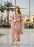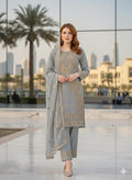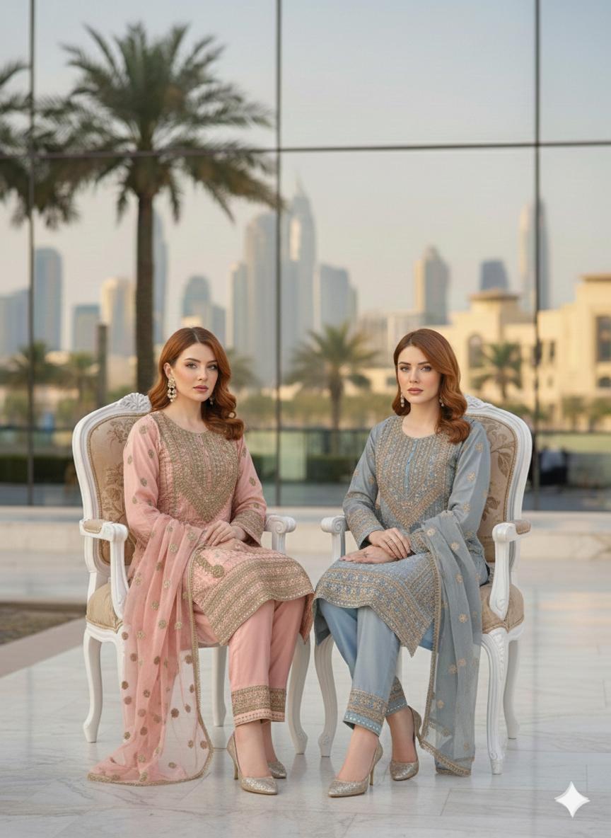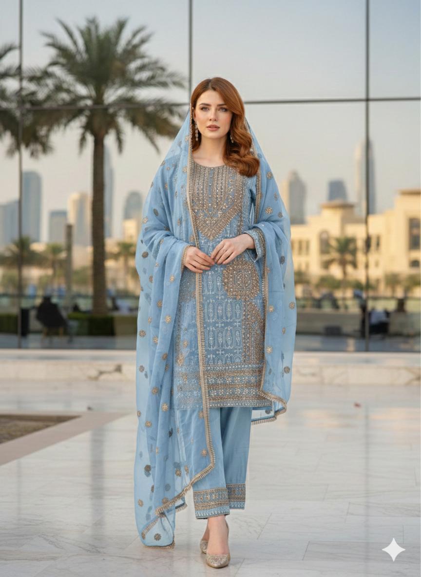 Elevate your ethnic wardrobe with this exquisite three-piece chiffon suit, meticulously crafted for the discerning gentleman. The premium ensemble features intricate zari and stone embroidery detailing that commands attention without overwhelming the silhouette. This ready-to-wear collection includes a beautifully embellished kurta, tailored trousers, and a coordinating dupatta, offering a complete, polished look suitable for celebrations, formal gatherings, or elevated everyday wear. The lightweight chiffon fabric ensures comfort and breathability, while the refined embroidery work reflects superior craftsmanship and attention to detail characteristic of luxury ethnic wear.