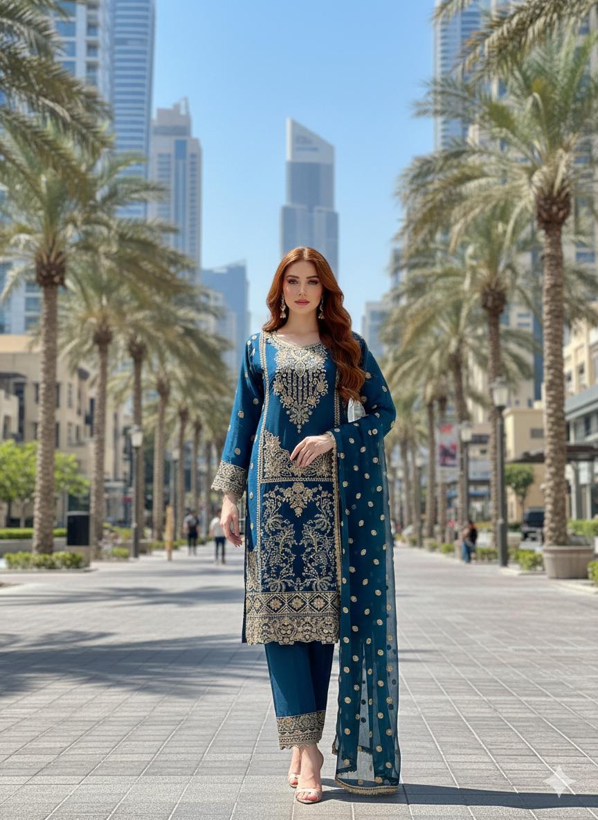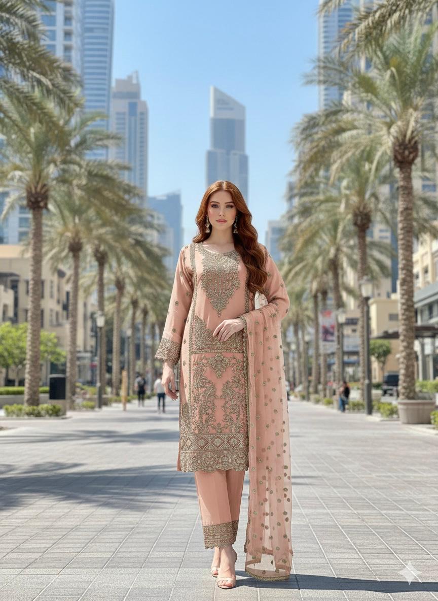 Elevate your ethnic wardrobe with this exquisite 3-piece chiffon suit, meticulously crafted for the discerning gentleman. The premium ensemble features intricate zari and stone embroidery detailing that commands attention without overwhelming the silhouette. This ready-to-wear set includes a beautifully embellished kurta, tailored trousers, and a coordinating dupatta, offering a complete, polished look for weddings, celebrations, and formal occasions. The lightweight chiffon fabric ensures comfort throughout extended wear, while the refined embroidery work reflects superior craftsmanship. Perfect for those who appreciate quality construction and timeless elegance.