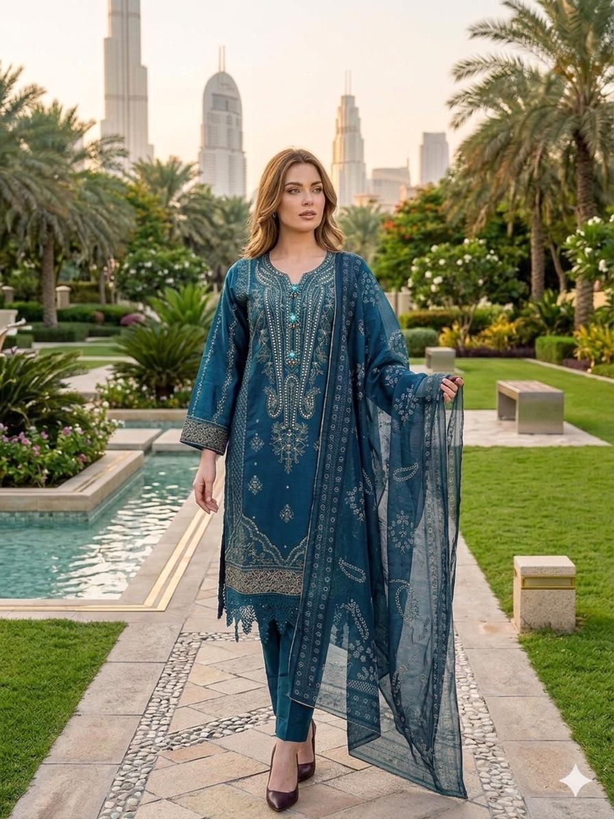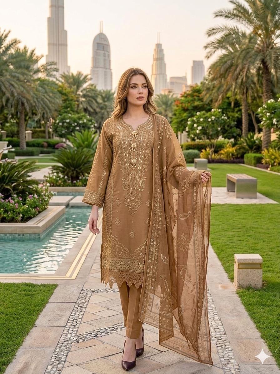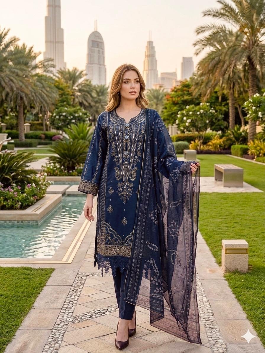 LS-3043  Premium Ready-to-Wear 3 Piece Viscose Suit |Sequins & Zari Embroidery|Trouser & Linen Slub Dupatta