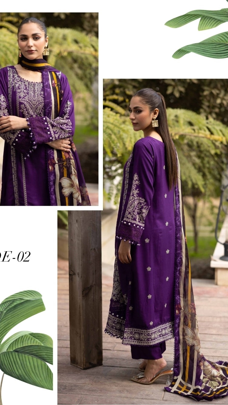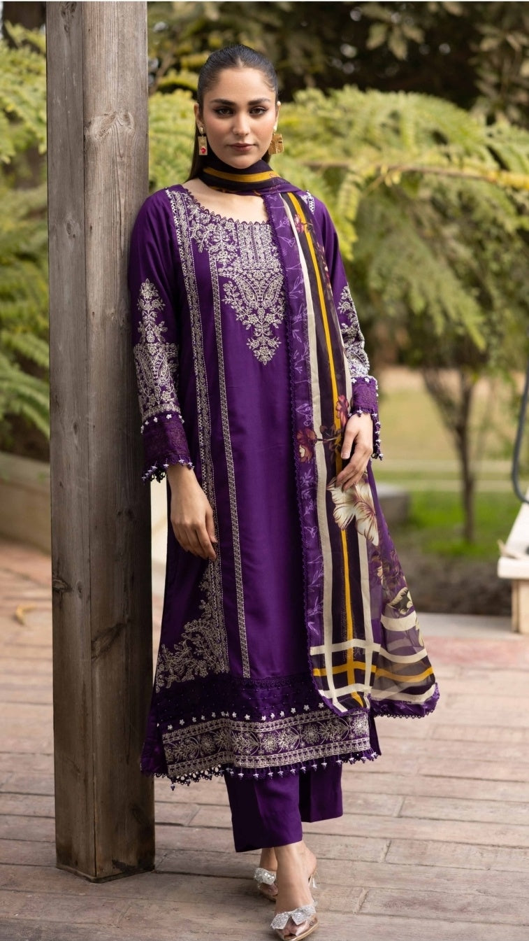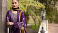 Fabric and Color: The suit is grounded in a deep, rich purple hue, which we call Regal Violet. The fabric of the kameez and trouser is Premium Winter Lux Linen, offering a substantial, warm feel and a beautiful drape.
